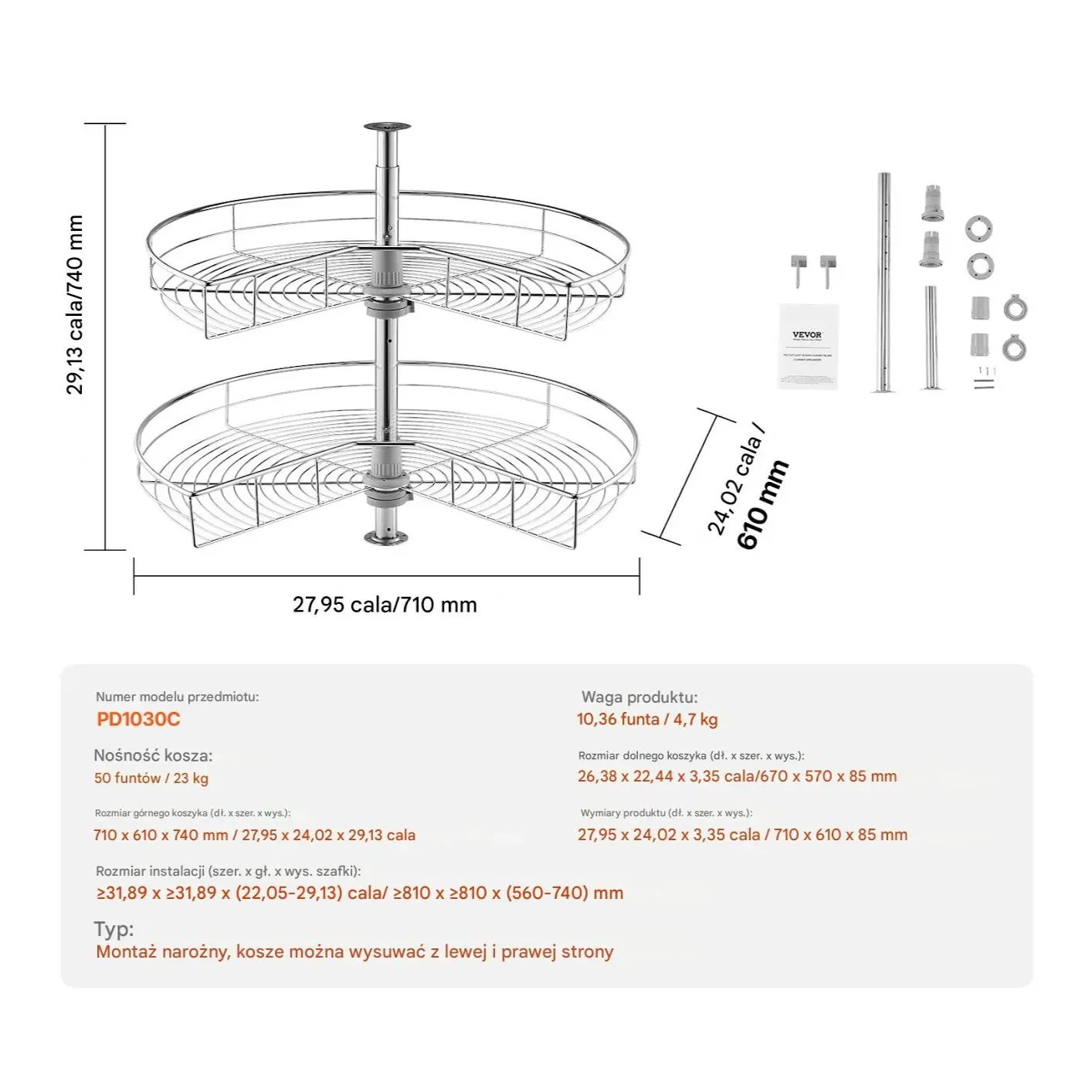 - ✅ Łatwy montaż – pasuje do większości standardowych szafek narożnych
