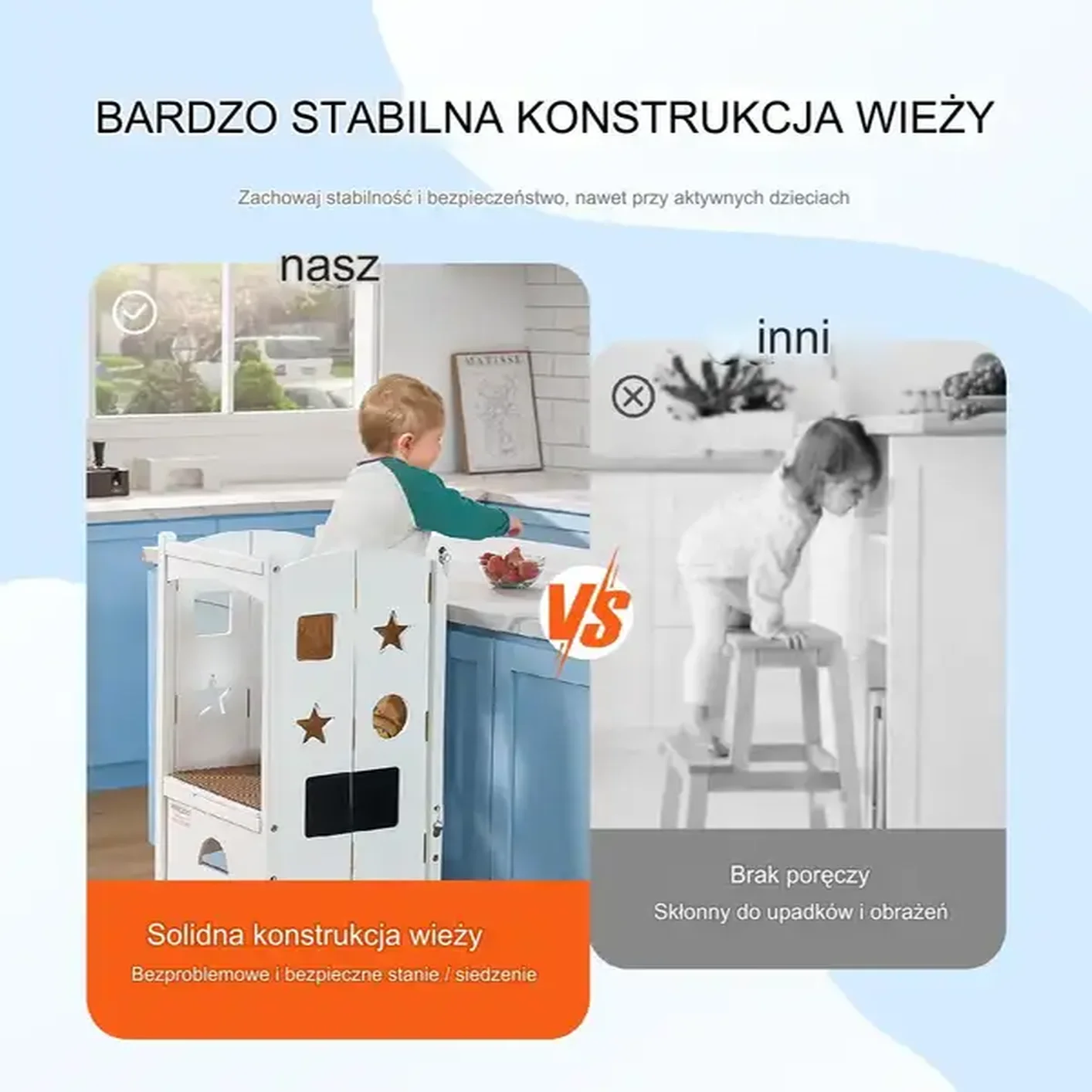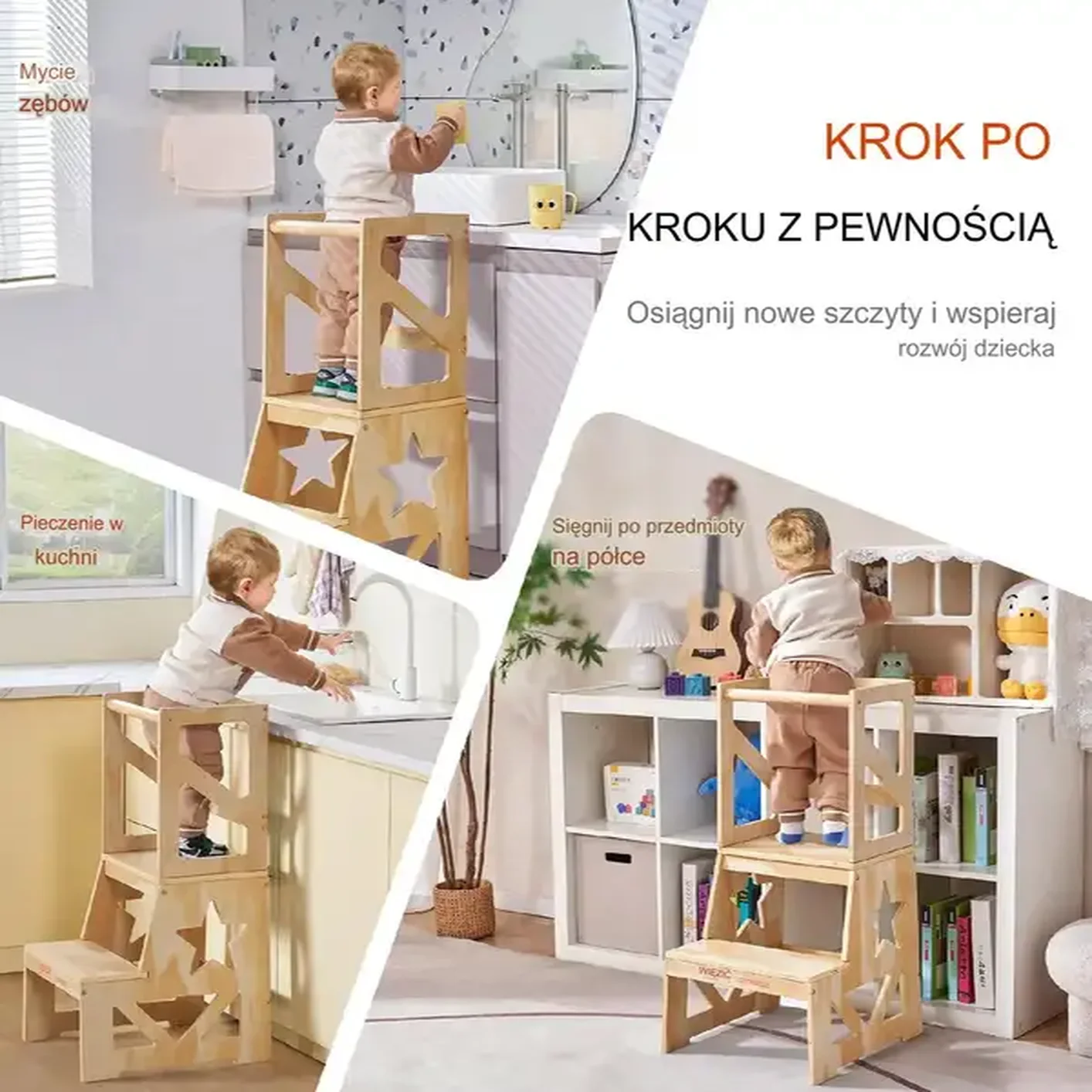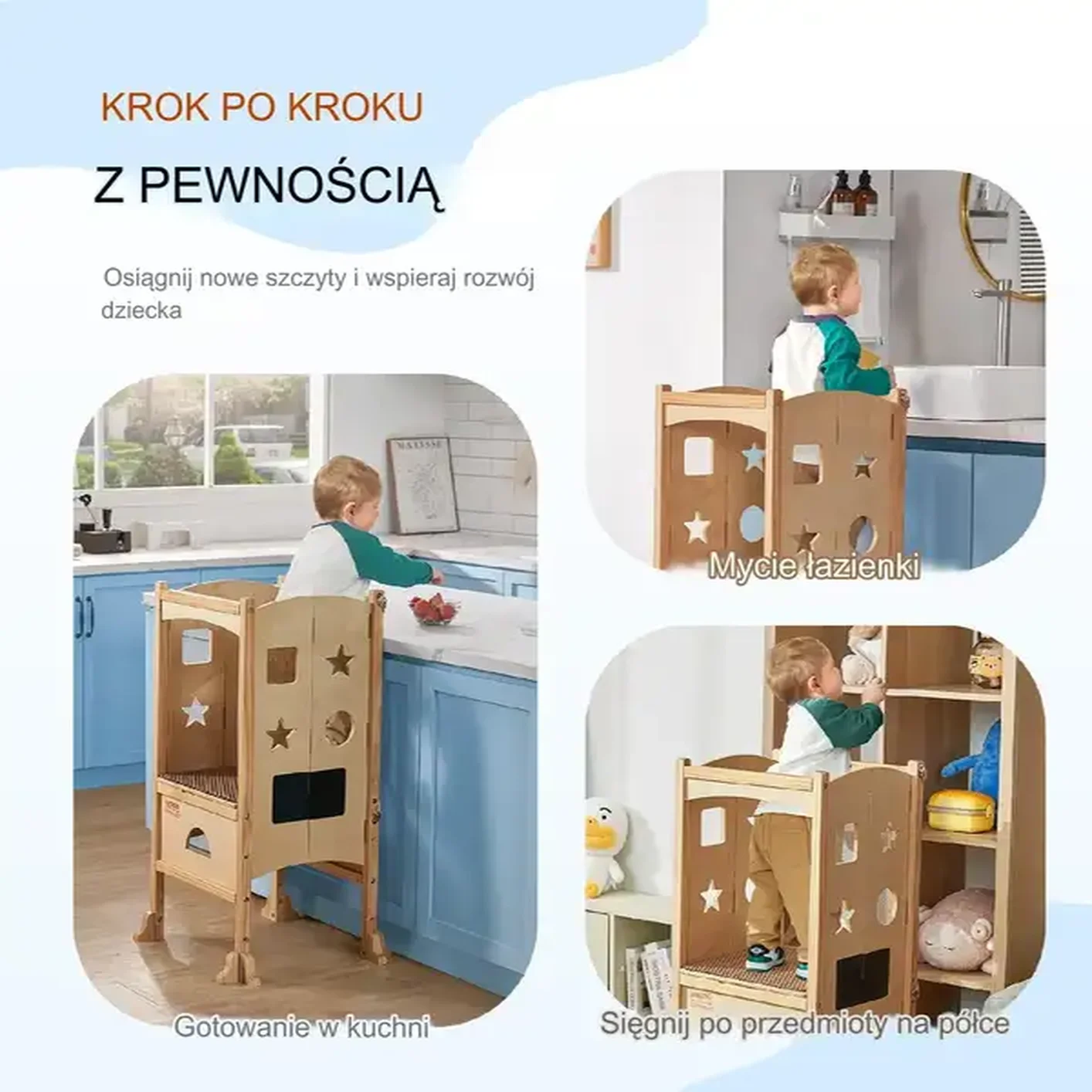 • Wszechstronne zastosowanie: Idealny do kuchni, łazienki, sypialni – wszędzie tam, gdzie dziecko potrzebuje dodatkowego wzrostu.