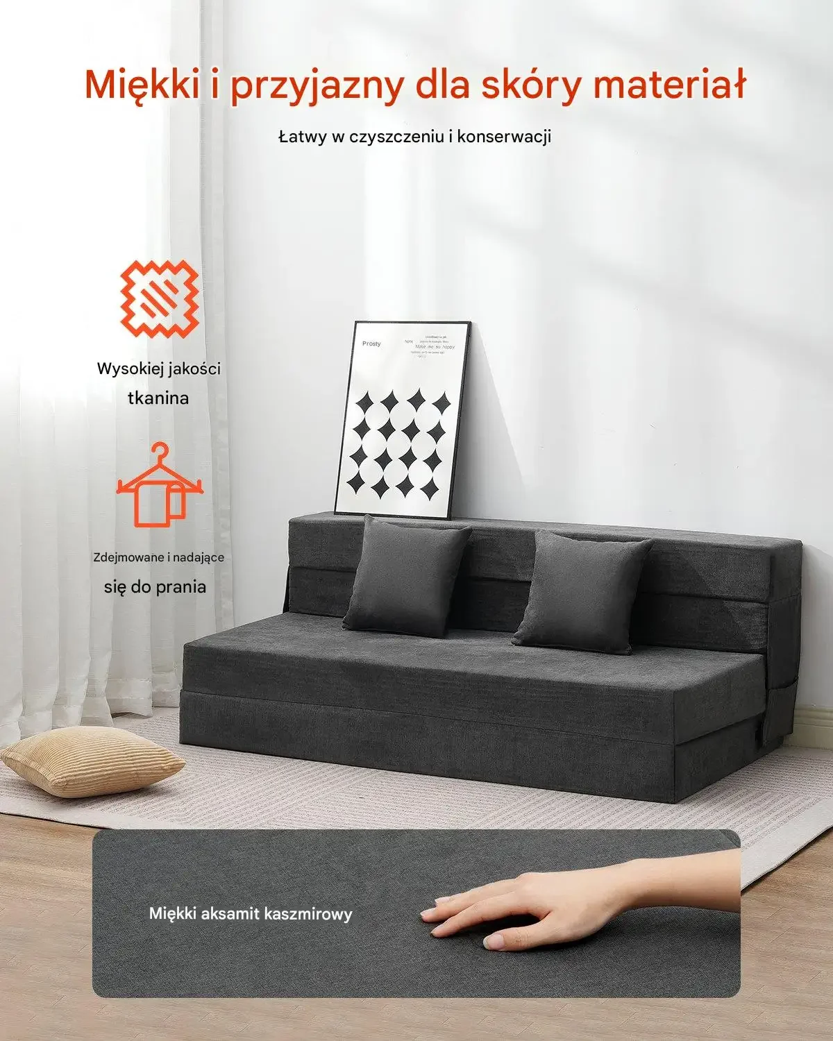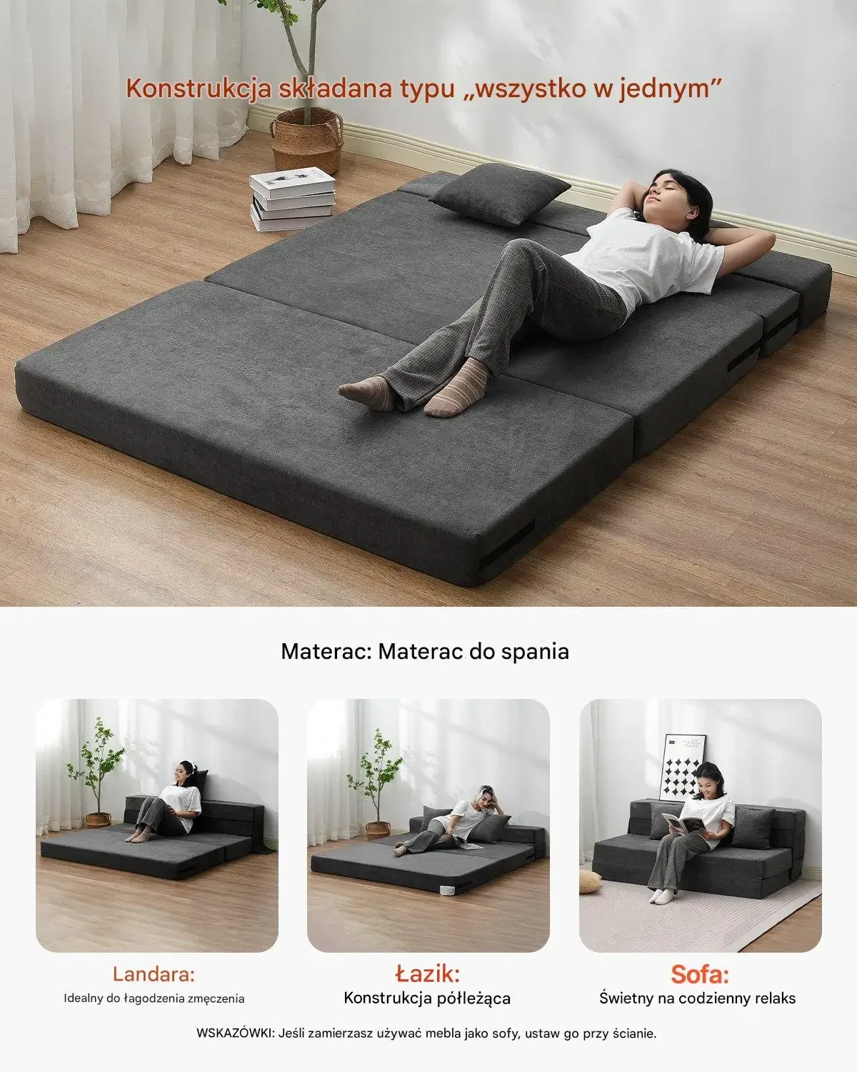 • 3 w 1 – kanapa, leżanka, łóżko: Wielofunkcyjność w jednym meblu.