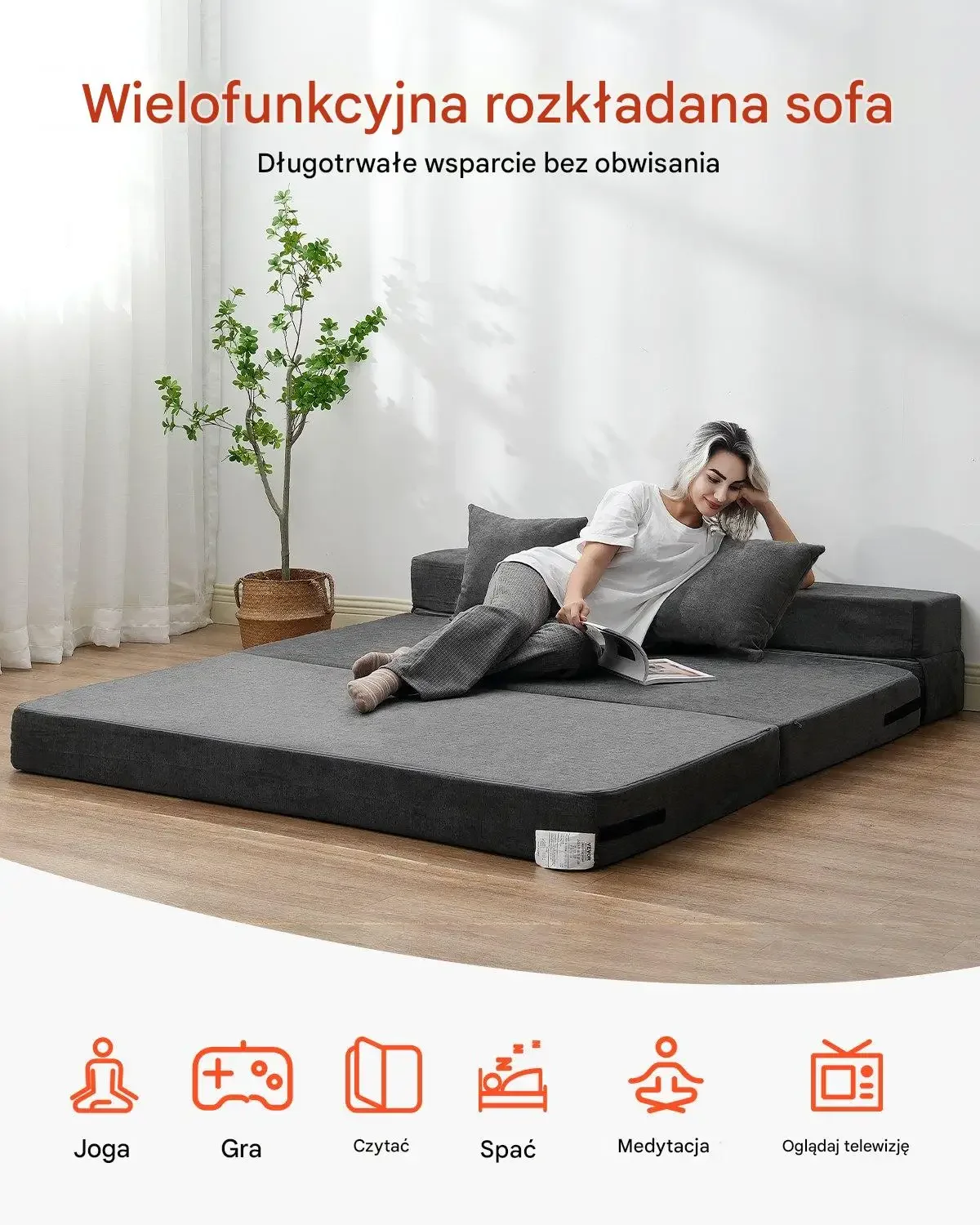 Wielofunkcyjna sofa rozkładana zapewnia długotrwałe wsparcie bez obciążania kręgosłupa. Produkt łączy funkcję wygodnego siedziska i komfortowego łóżka, idealnego do codziennego relaksu i odpoczynku.
