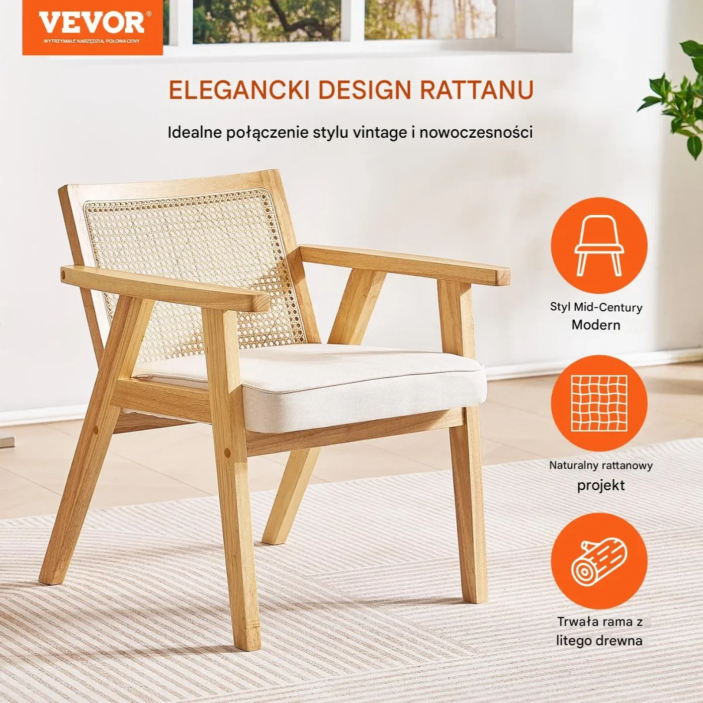 Krzesło rattanowe z podłokietnikami – do jadalni i salonu beżowe