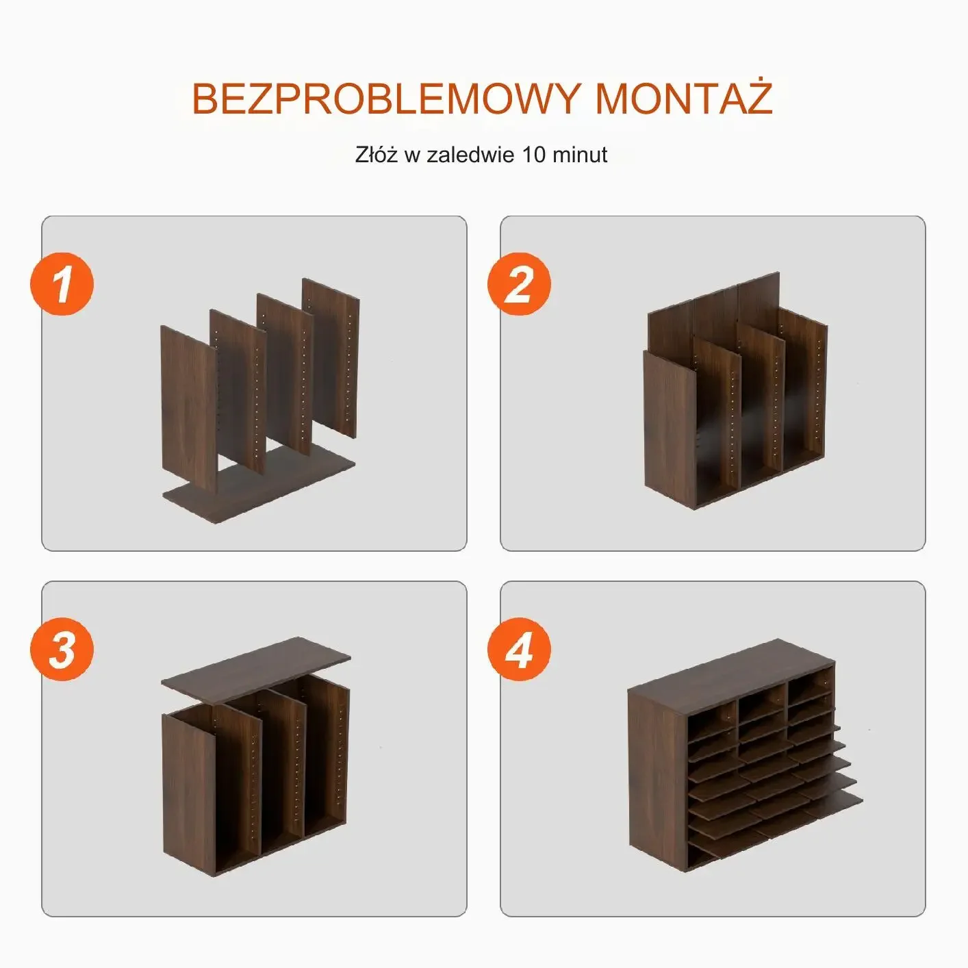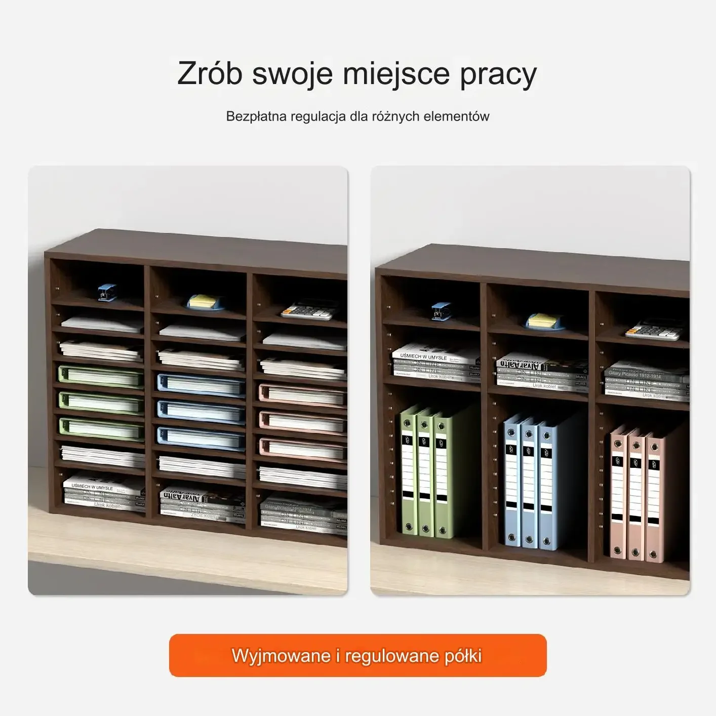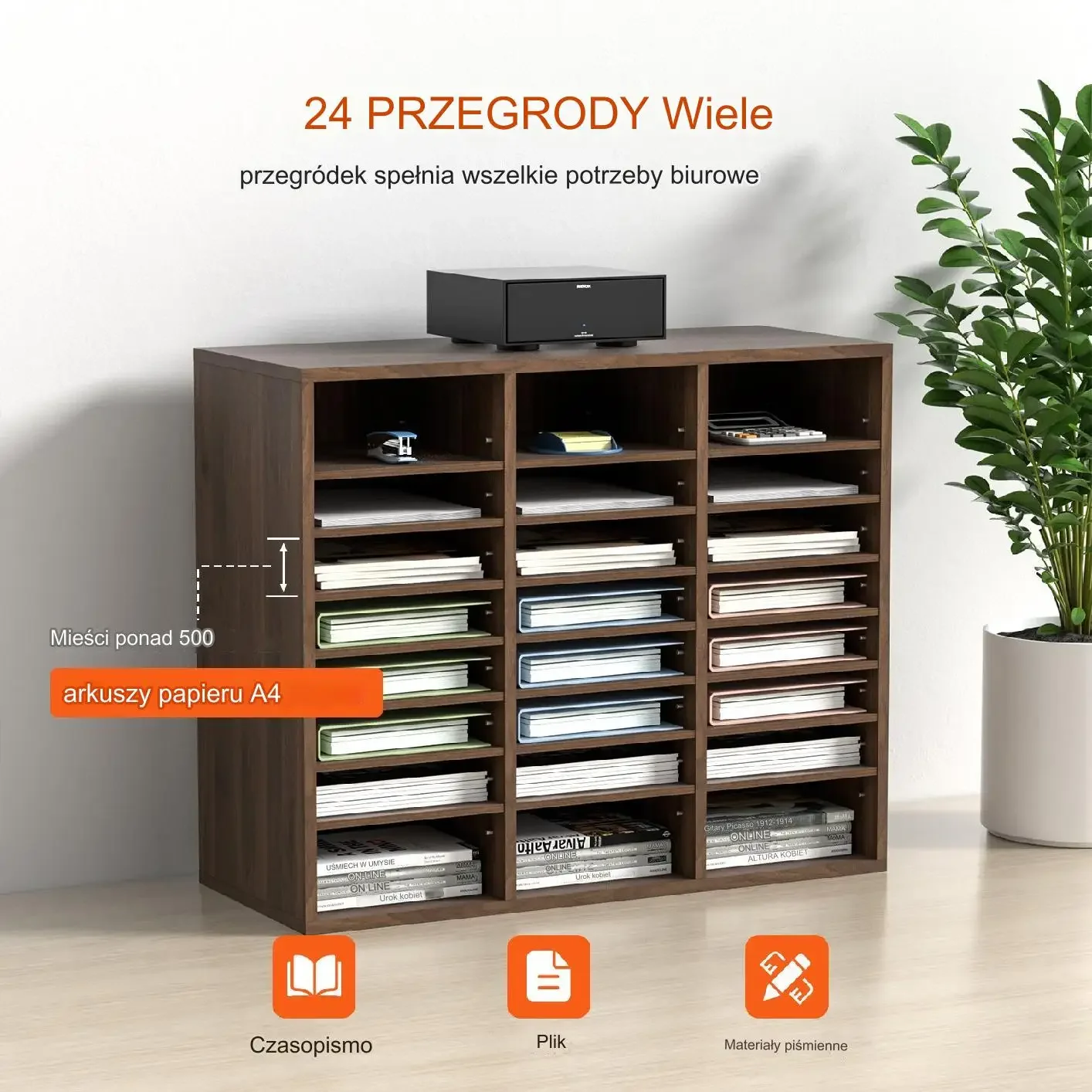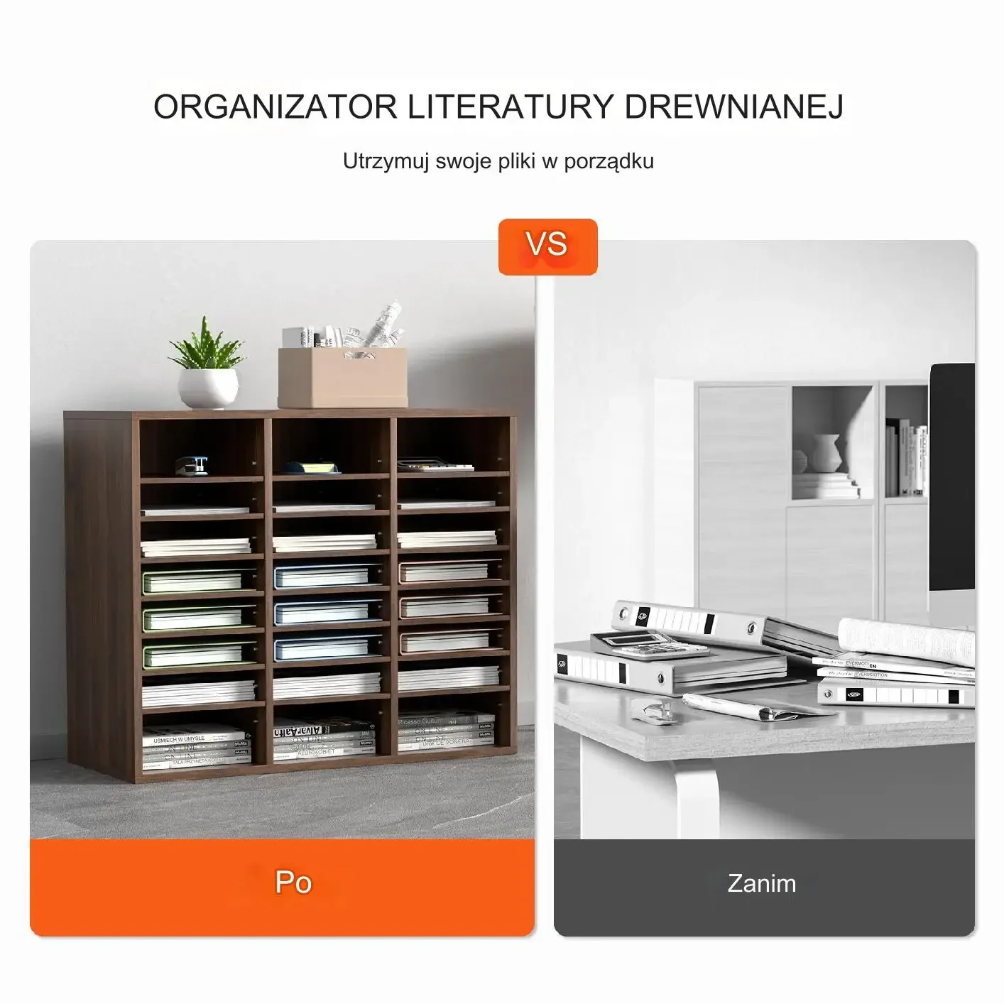 ✅ Pożegnaj bałagan na biurku! Drewniany regał na dokumenty to praktyczny sposób na organizację przestrzeni. ✅ 24 przegródki rozmieszczone w 8 rzędach i 3 kolumnach pozwalają przechowywać książki, dokumenty, czasopisma i akcesoria biurowe w uporządkowany sposób.