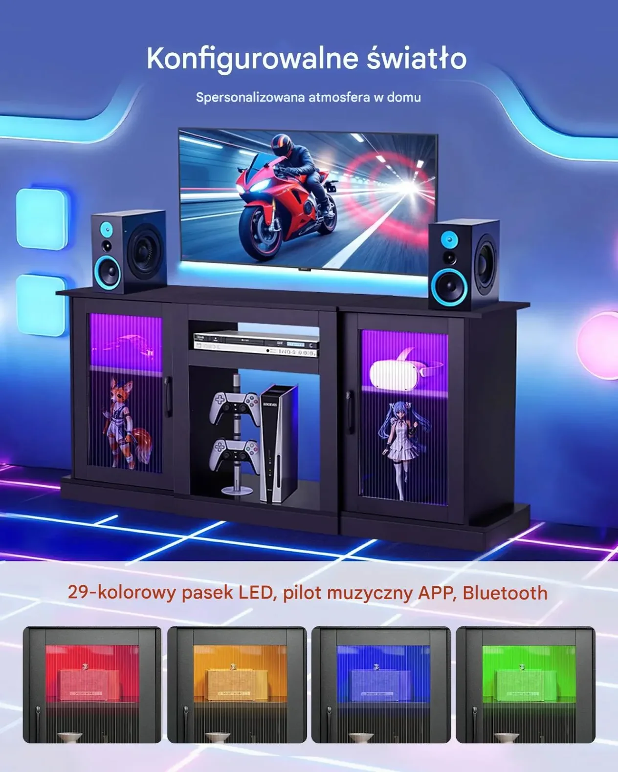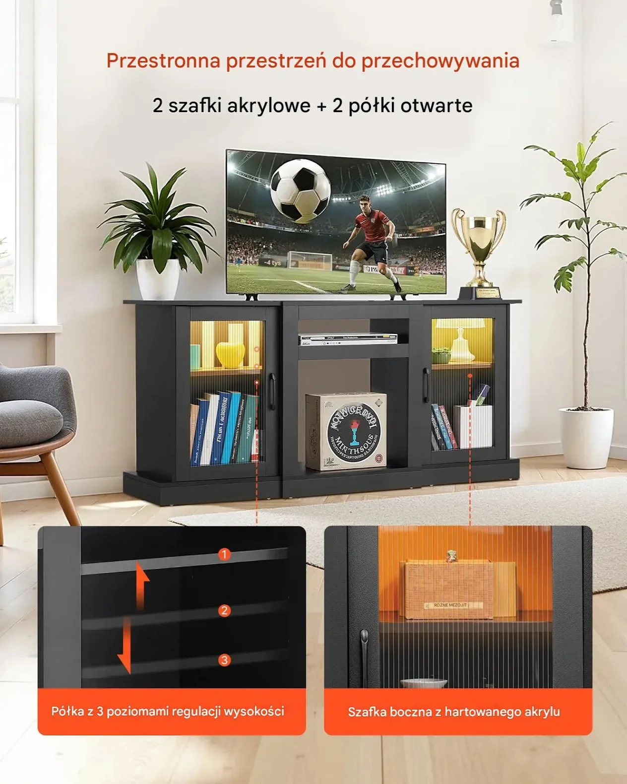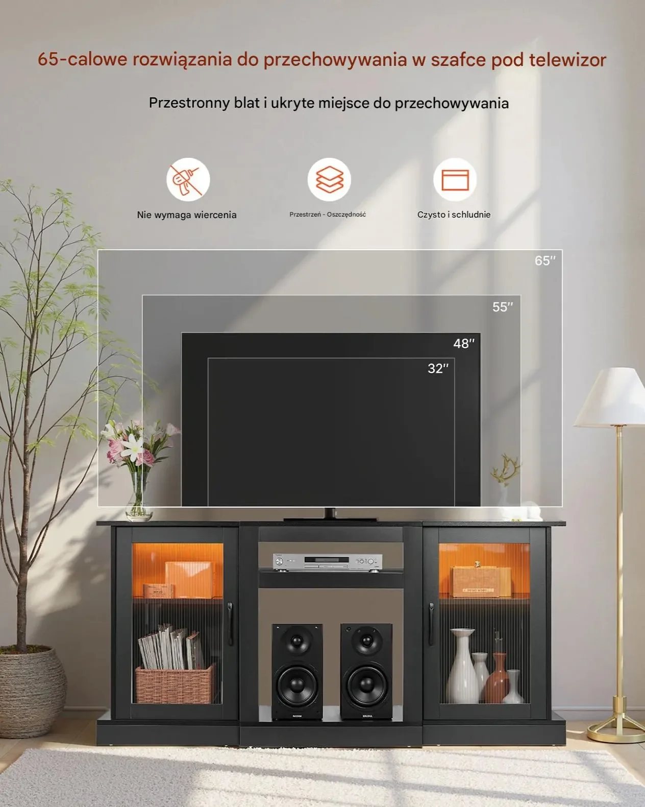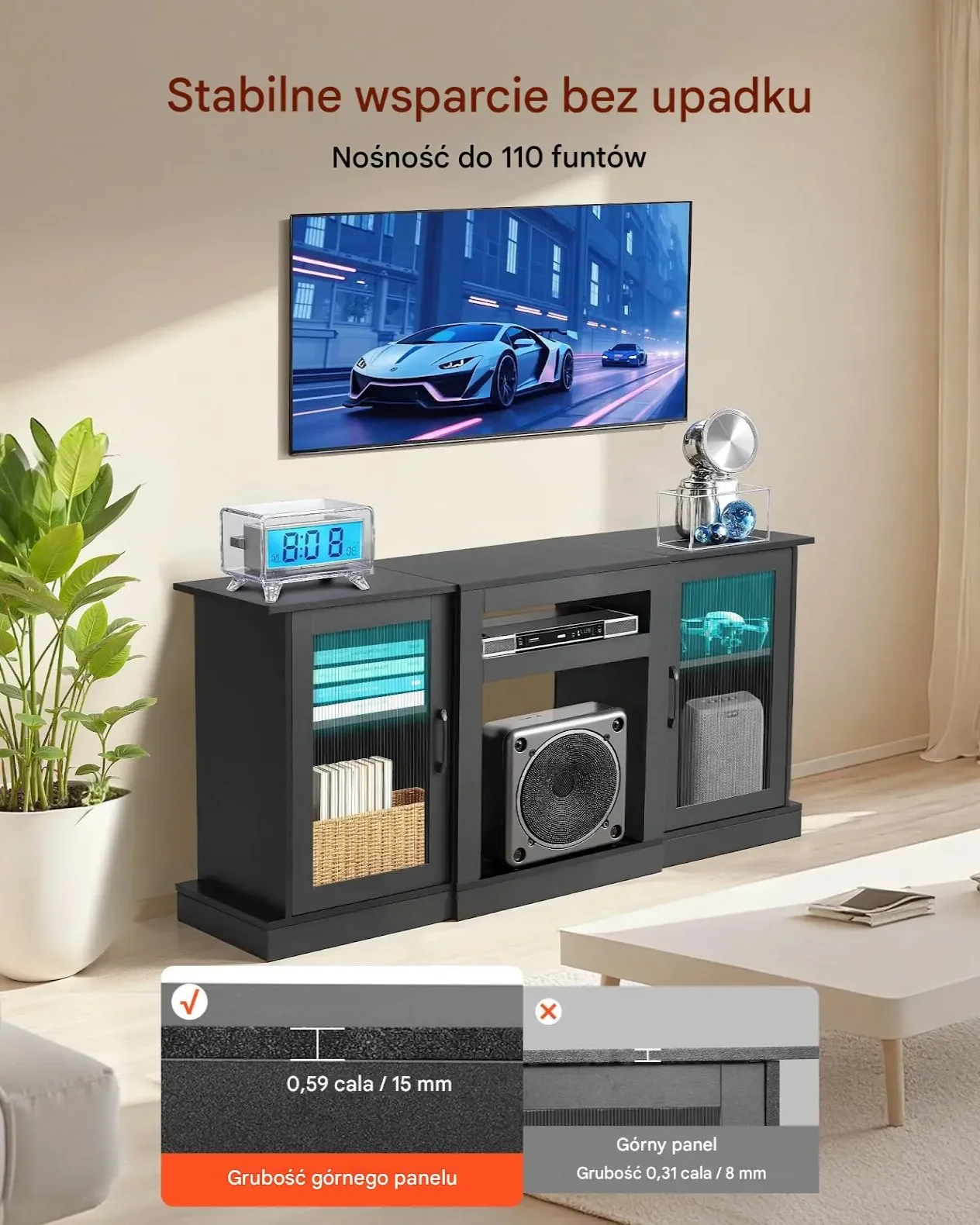 - ⭐ Przestrzeń multimedialna: Przechowywanie konsol, głośników i urządzeń streamingowych