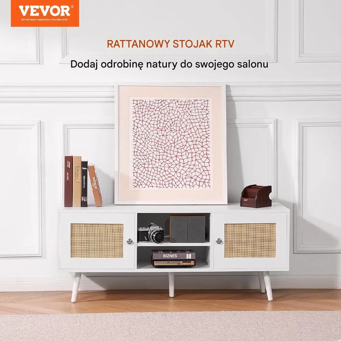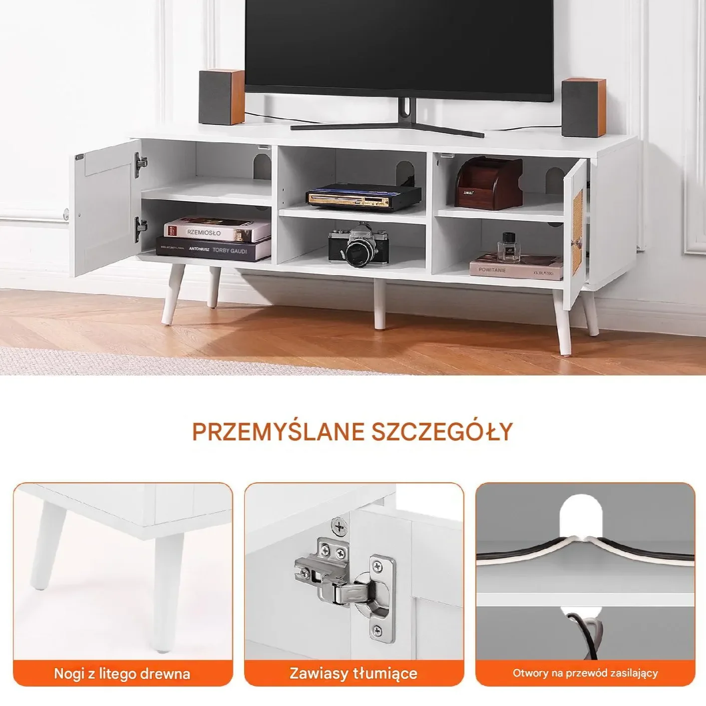 Szafka RTV Boho – Styl Mid-Century Modern, Rattan, do TV 55″, Biała