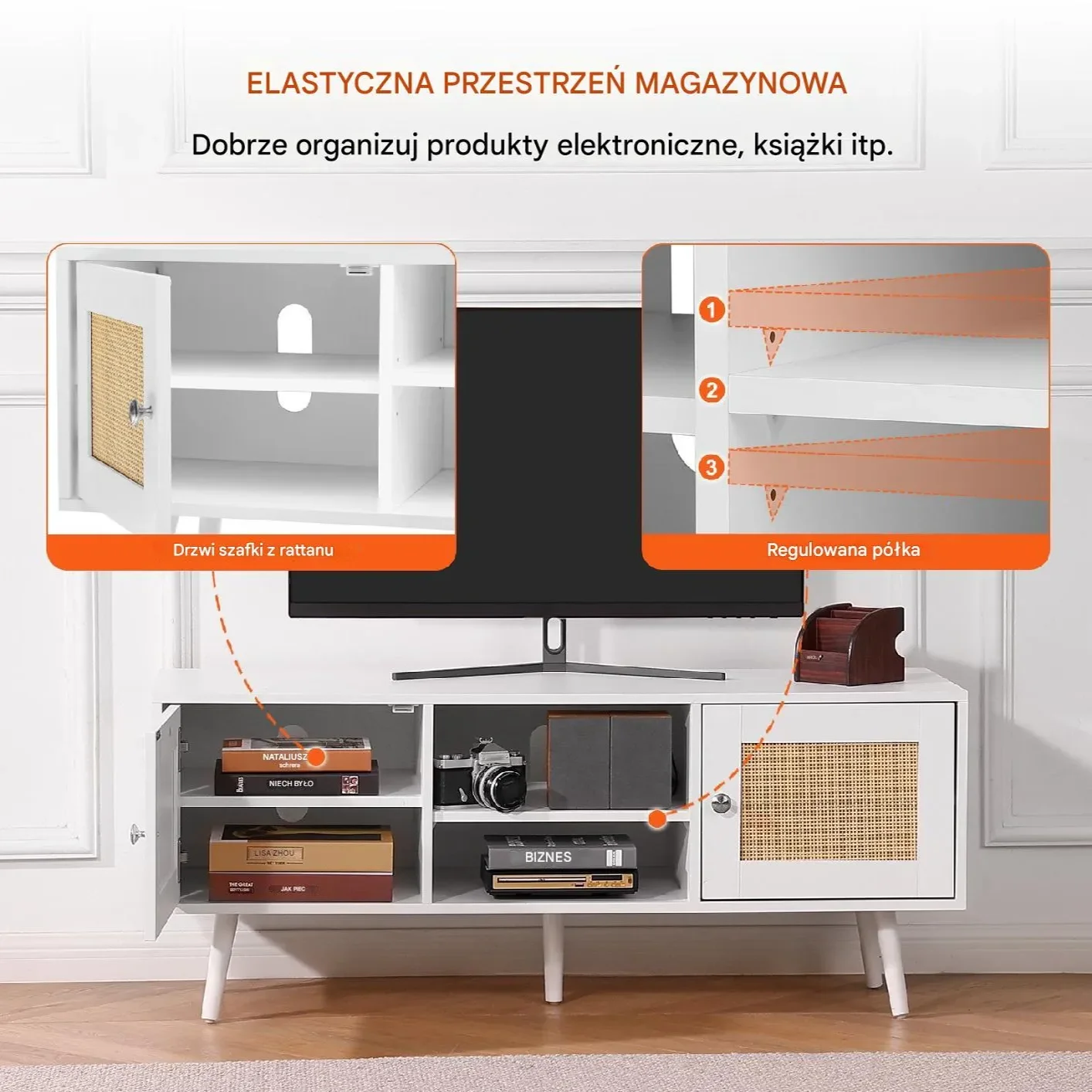 Elegancka szafka RTV zaprojektowana z myślą o nowoczesnych wnętrzach, łącząca w sobie naturalny urok rattanu z minimalistyczną bielą. Wytrzymała konstrukcja oraz przemyślane detale sprawiają, że jest idealnym wyborem do salonu lub pokoju multimedialnego. Przystosowana do telewizorów o przekątnej do 55 cali, z regulowanymi półkami, które zwiększają komfort użytkowania.