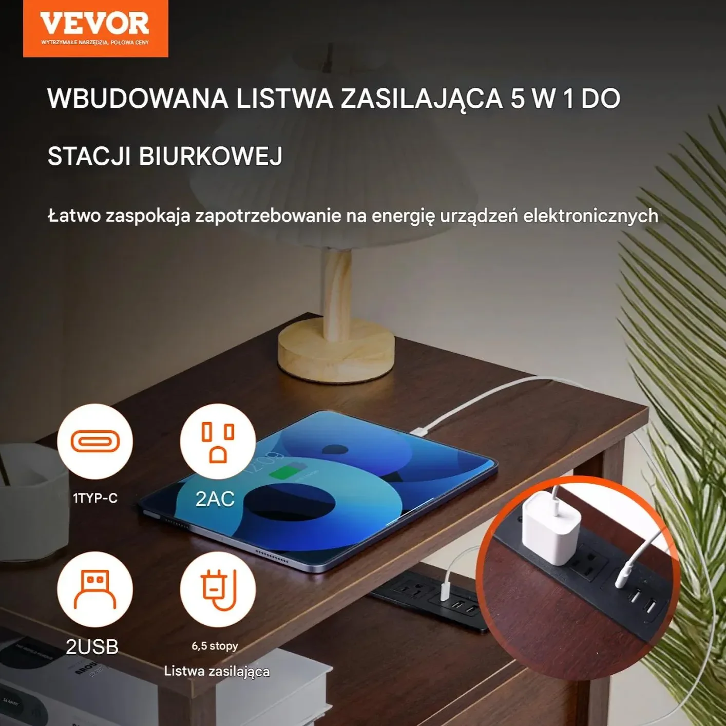- ✅ Wbudowana stacja ładowania: 2 gniazdka AC, 2 porty USB i 1 port Type-C – ładowanie wszystkich urządzeń w zasięgu ręki.