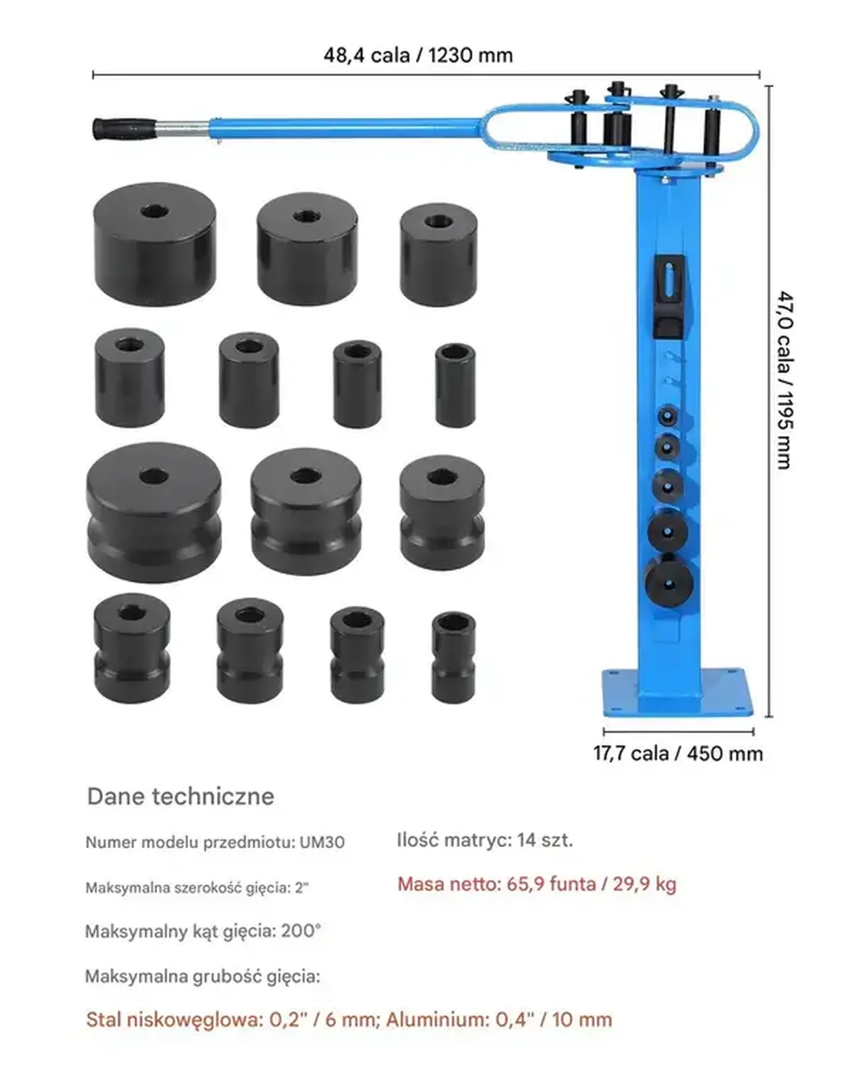 - ✅ 14 wysokiej jakości matryc: 7 matryc do gięcia i 7 do rur okrągłych, dopasowanych do różnych średnic i profili
