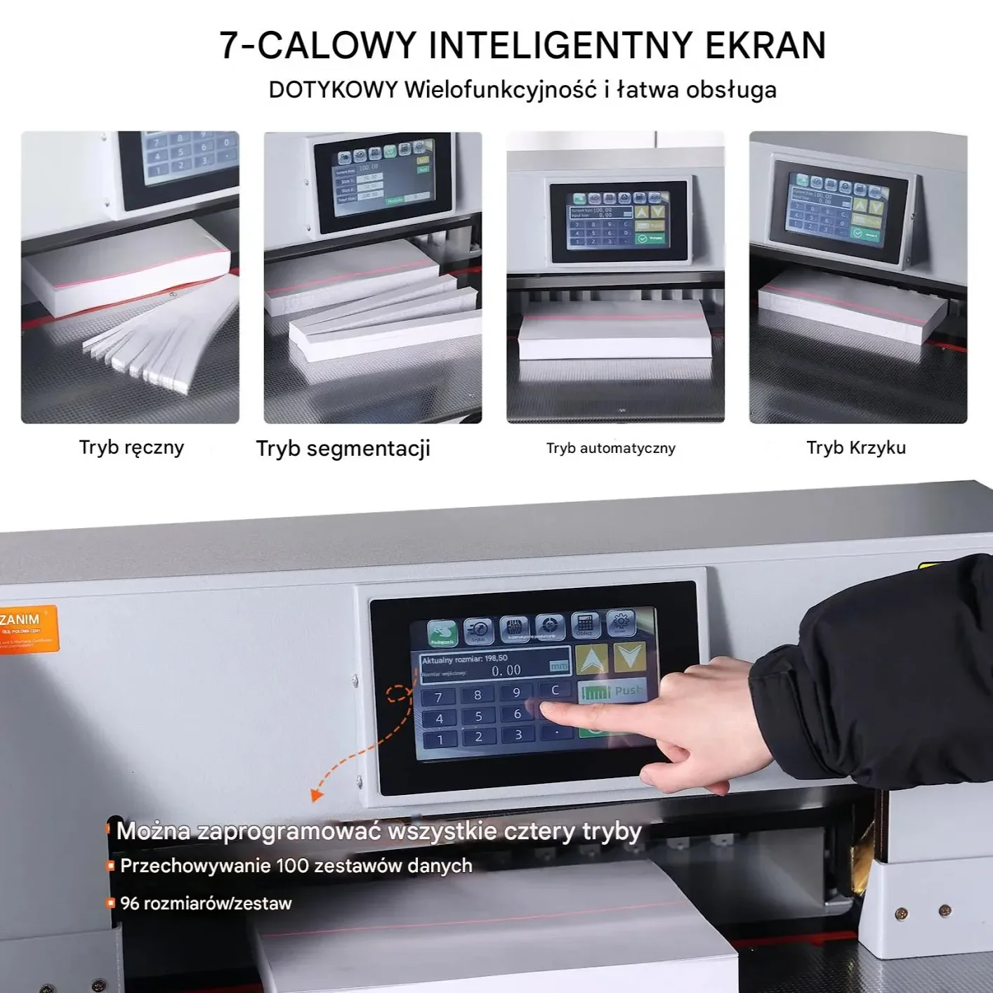 - ✅ Intuicyjny ekran dotykowy: 7-calowy wyświetlacz ułatwia obsługę, z możliwością zapisania aż 100 zestawów rozmiarów.