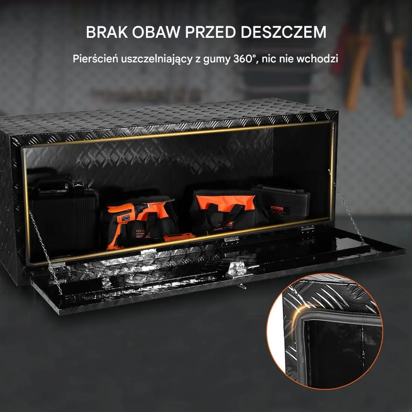 - ✅ Ochrona przed wodą: Uszczelka gumowa zapewnia szczelne zamknięcie, chroniąc zawartość przed deszczem.
