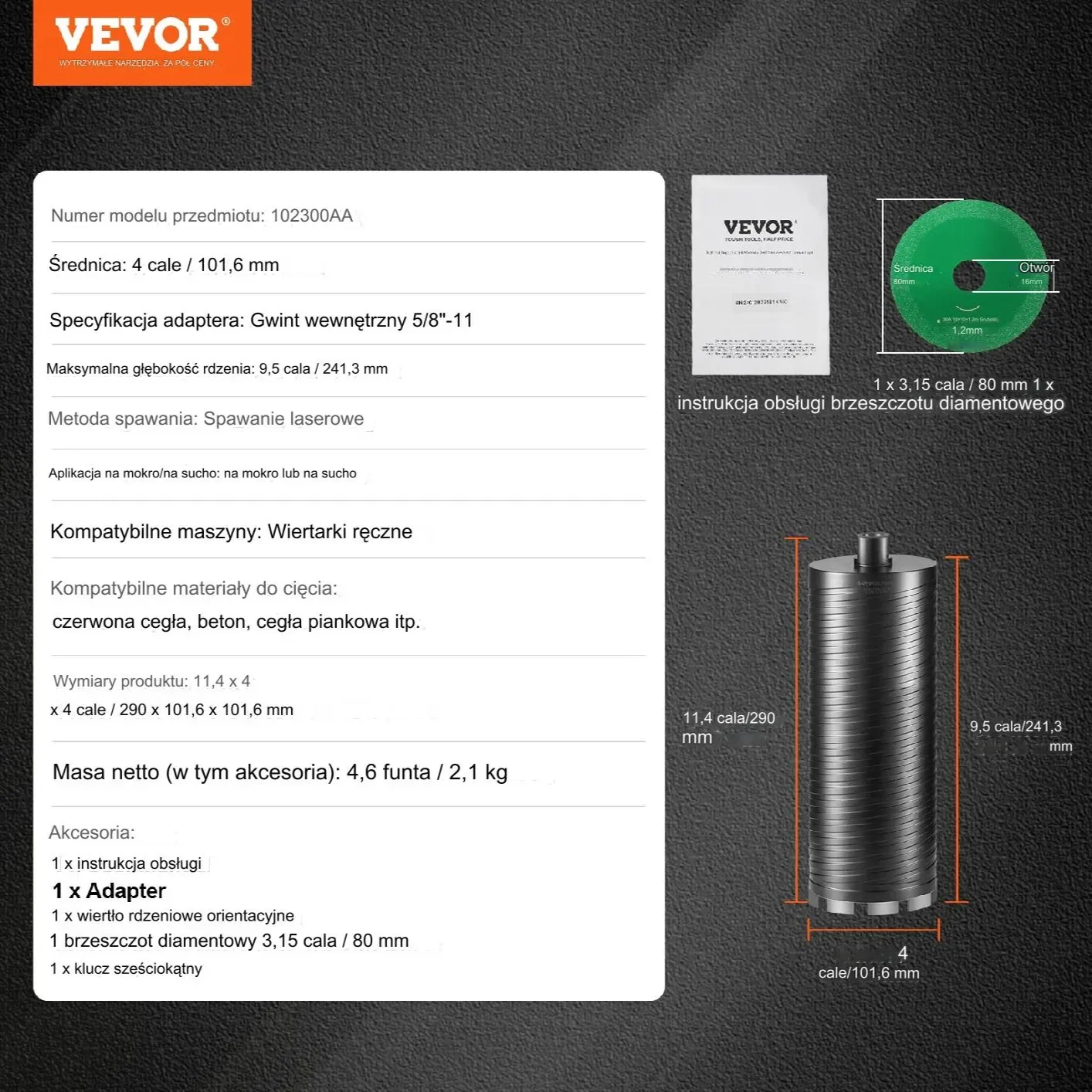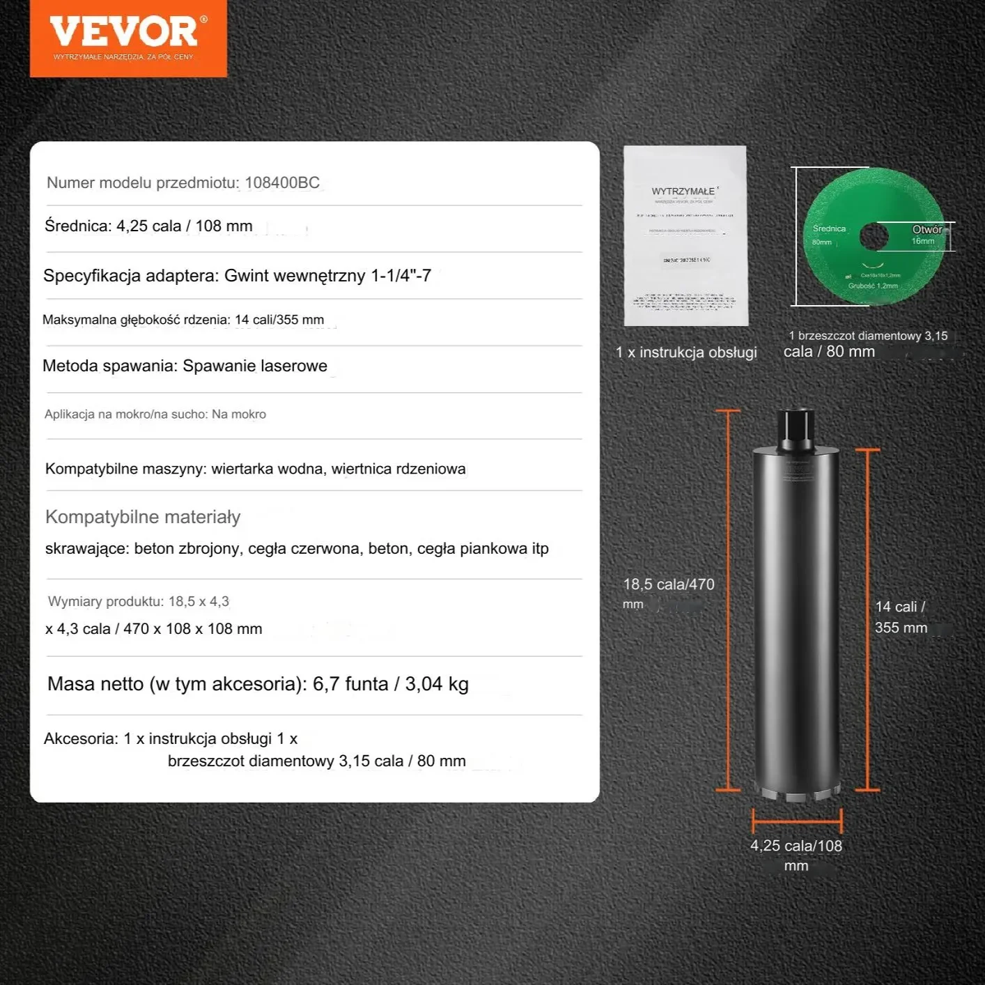 Wiertło diamentowe koronowe 108mm do betonu cegły głębokość 35cm