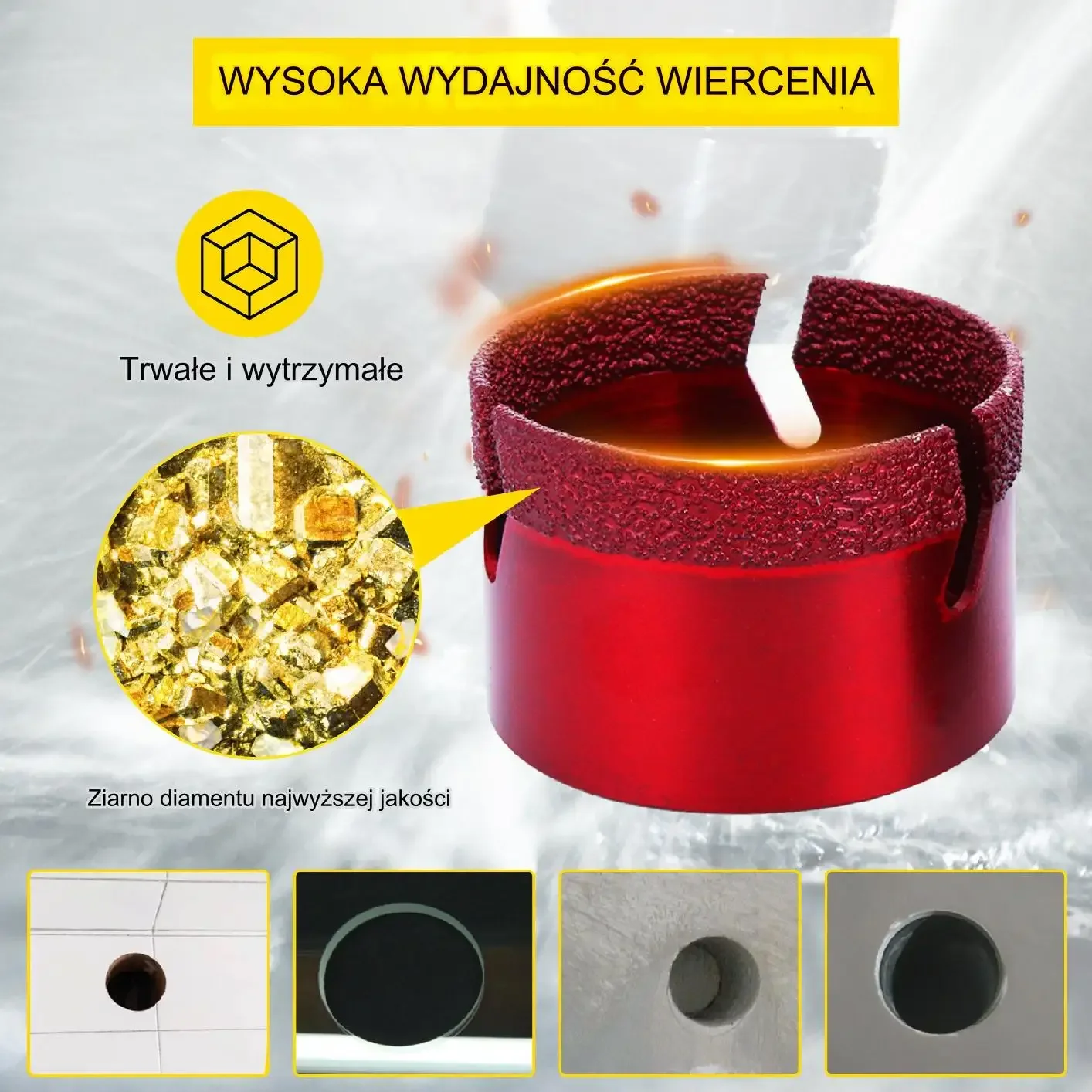 ➡️ Precyzja cięcia: Diamentowe ostrza gwarantują czyste i dokładne otwory.