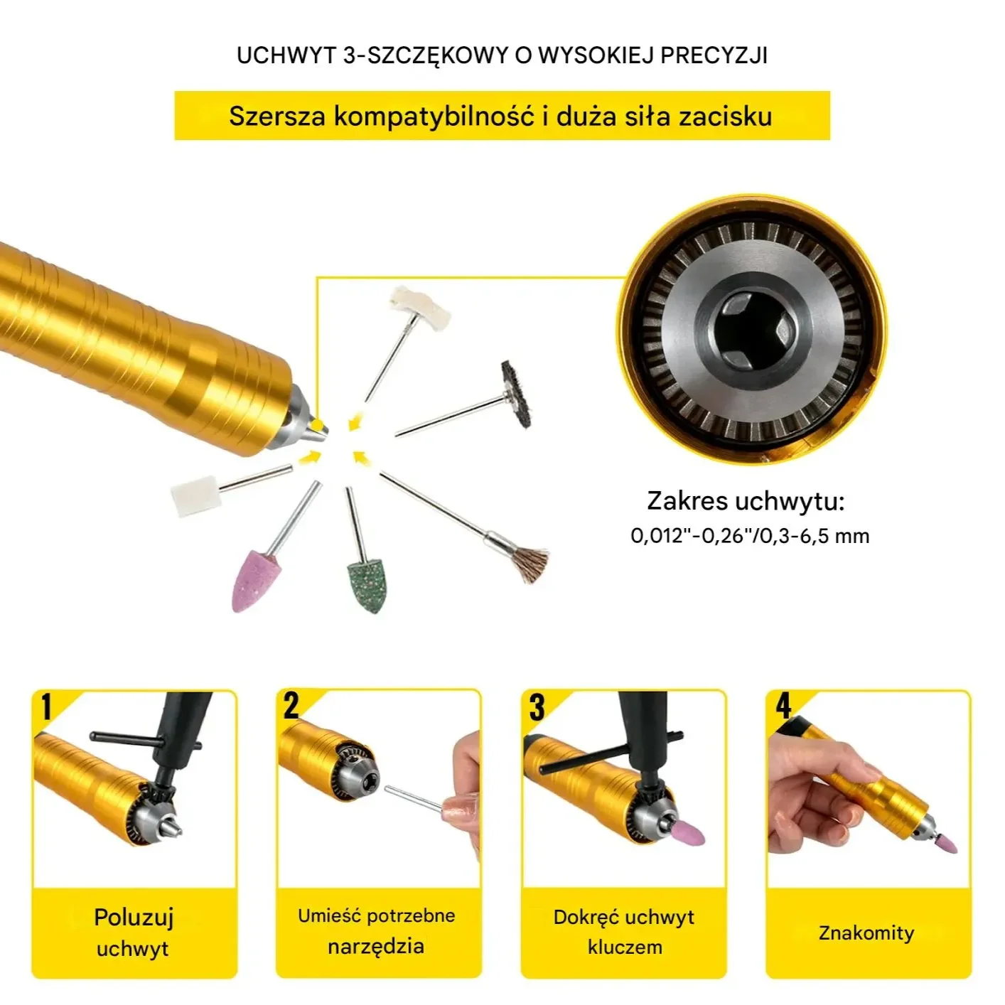 - ✅ Uniwersalny uchwyt trójszczękowy: Kompatybilny z akcesoriami 0,3-6,5 mm dzięki mocnemu uchwytowi