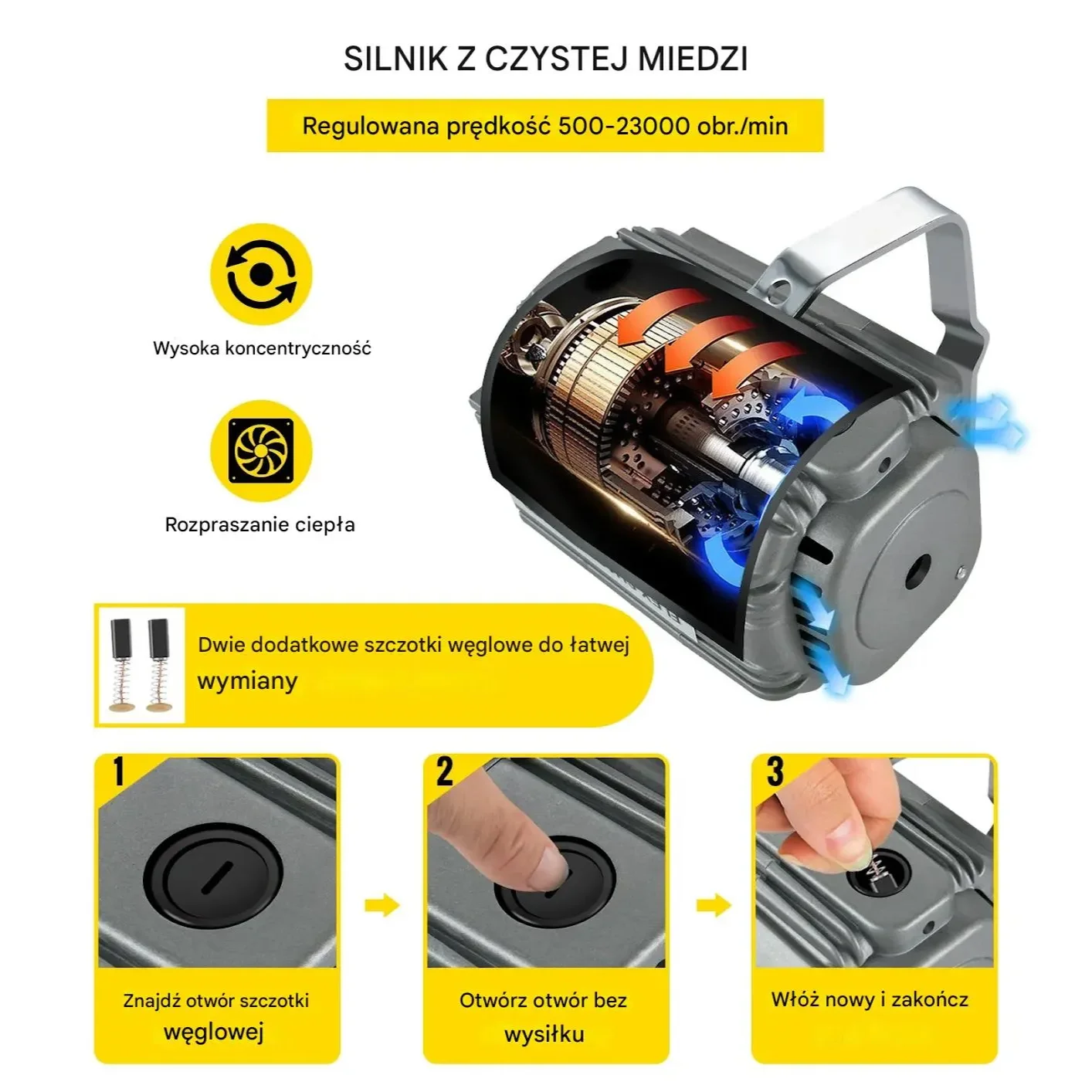 - ✅ Chłodzenie i wymienne szczotki węglowe: System wentylacji zapobiega przegrzaniu, a łatwa wymiana szczotek przedłuża żywotność