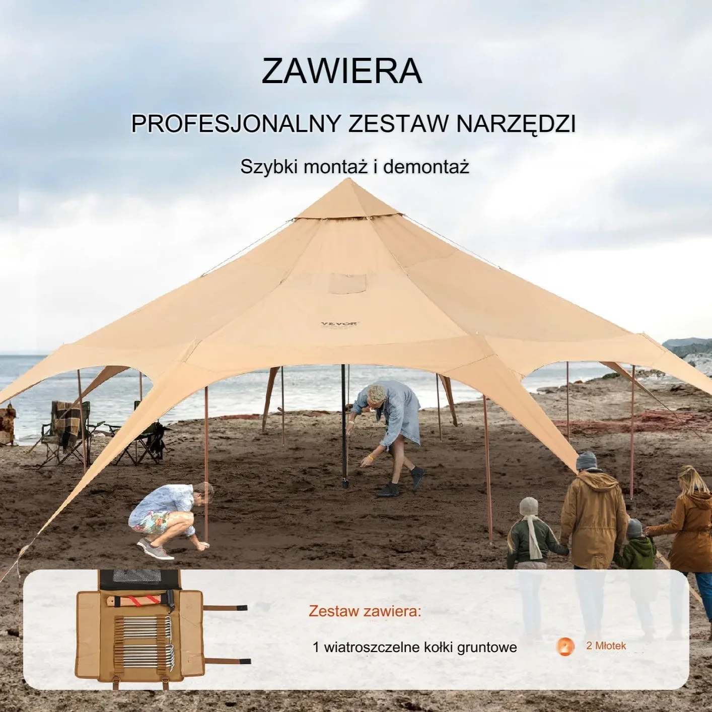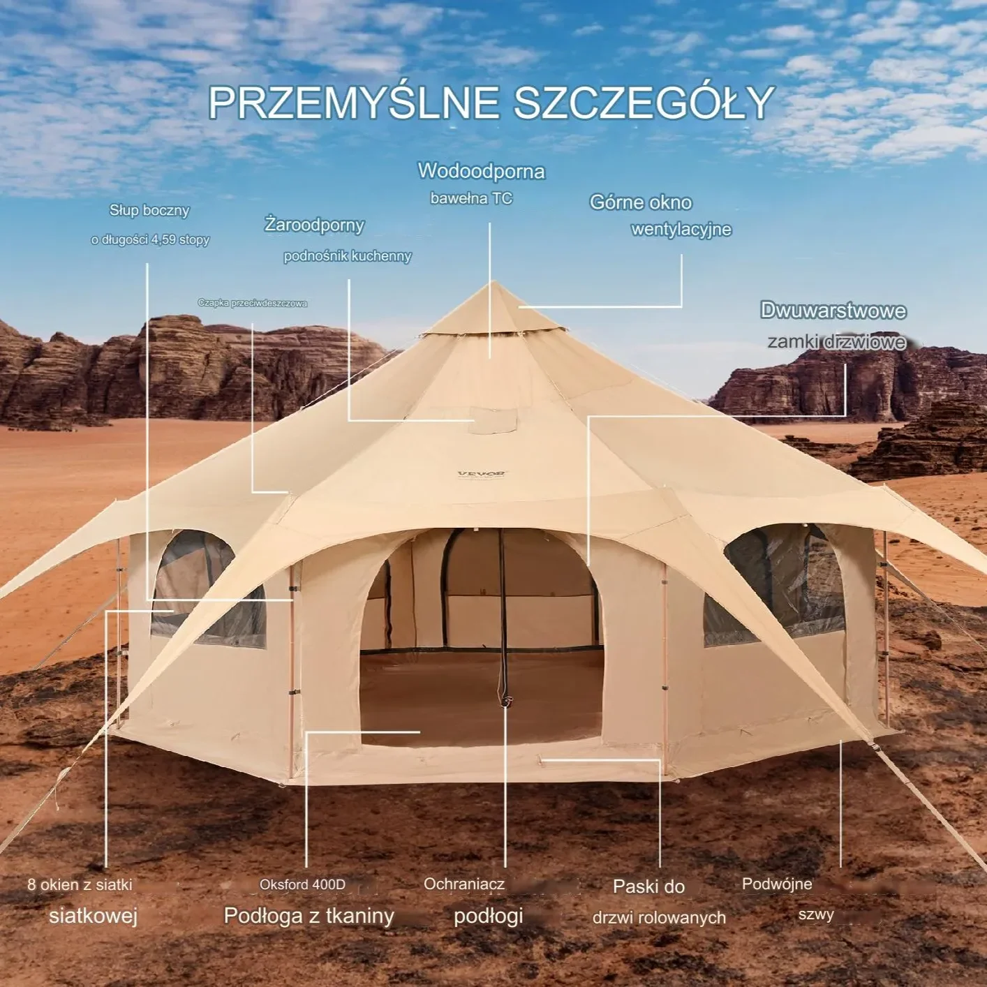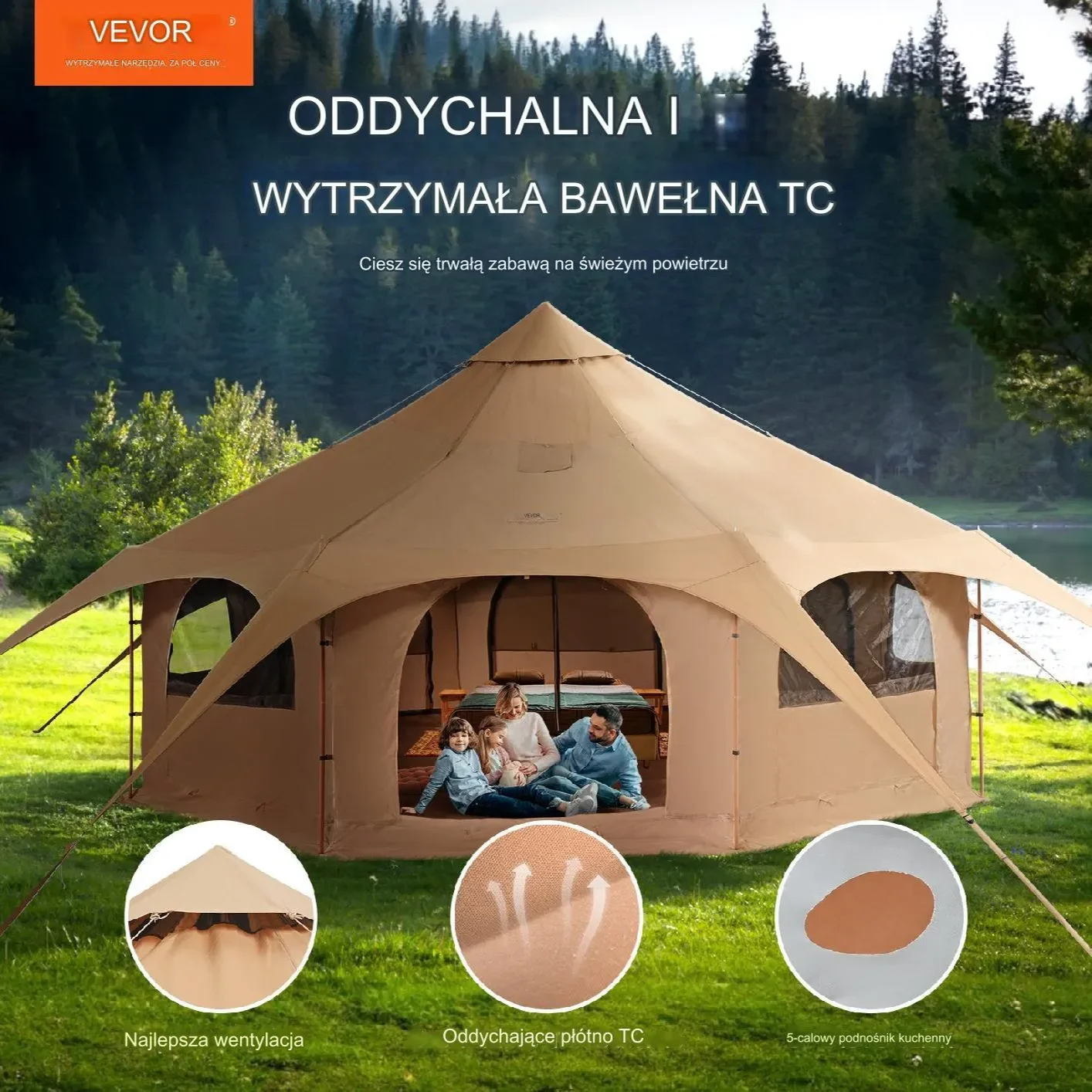 Poznaj namiot jurta mongolska o średnicy 5 m! Wykonany z trwałego płótna bawełnianego TC i wodoodpornej tkaniny Oxford, z 8 oknami i otworem na piecyk, oferuje przestronne wnętrze dla 8 osób – idealny na kemping w każdych warunkach pogodowych.