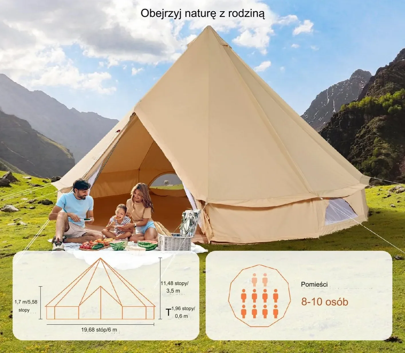 - ✅ Przestrzeń dla 10 osób – średnica 6 m, wysokość 3,5 m na grupowe biwaki.