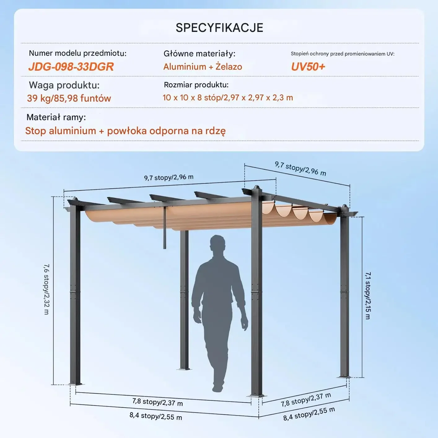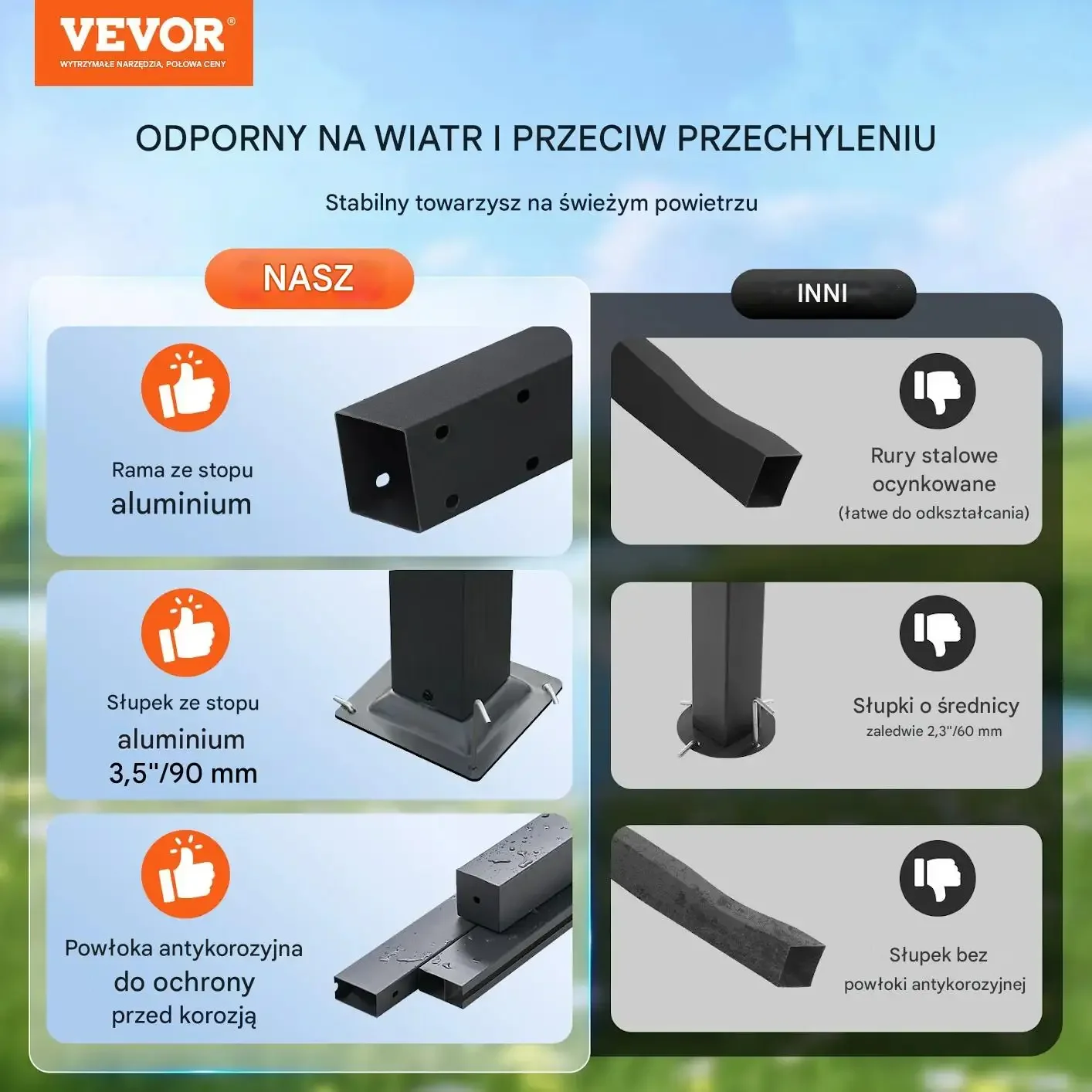 - ✅ Solidna konstrukcja: Wykonana z aluminium i żelaza z antykorozyjną powłoką, z grubymi słupami 90×90 mm zapewnia stabilność nawet w silnym wietrze