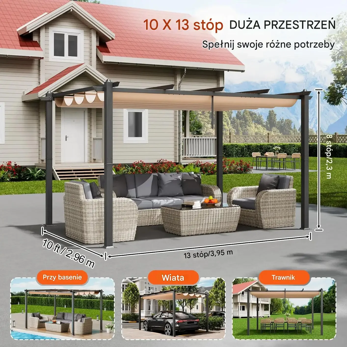 Ręcznie Rozsuwana Pergola 10×13 ft – Stabilna i Wytrzymała Ochrona Przed Słońcem