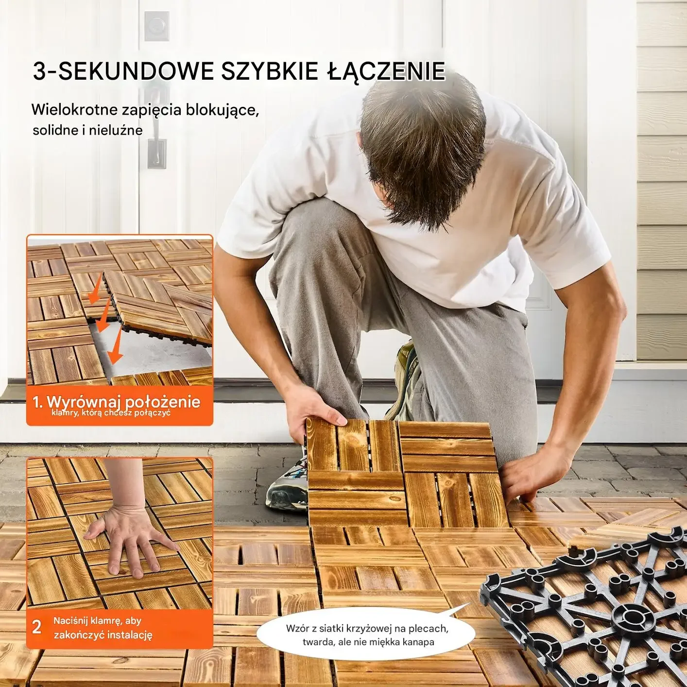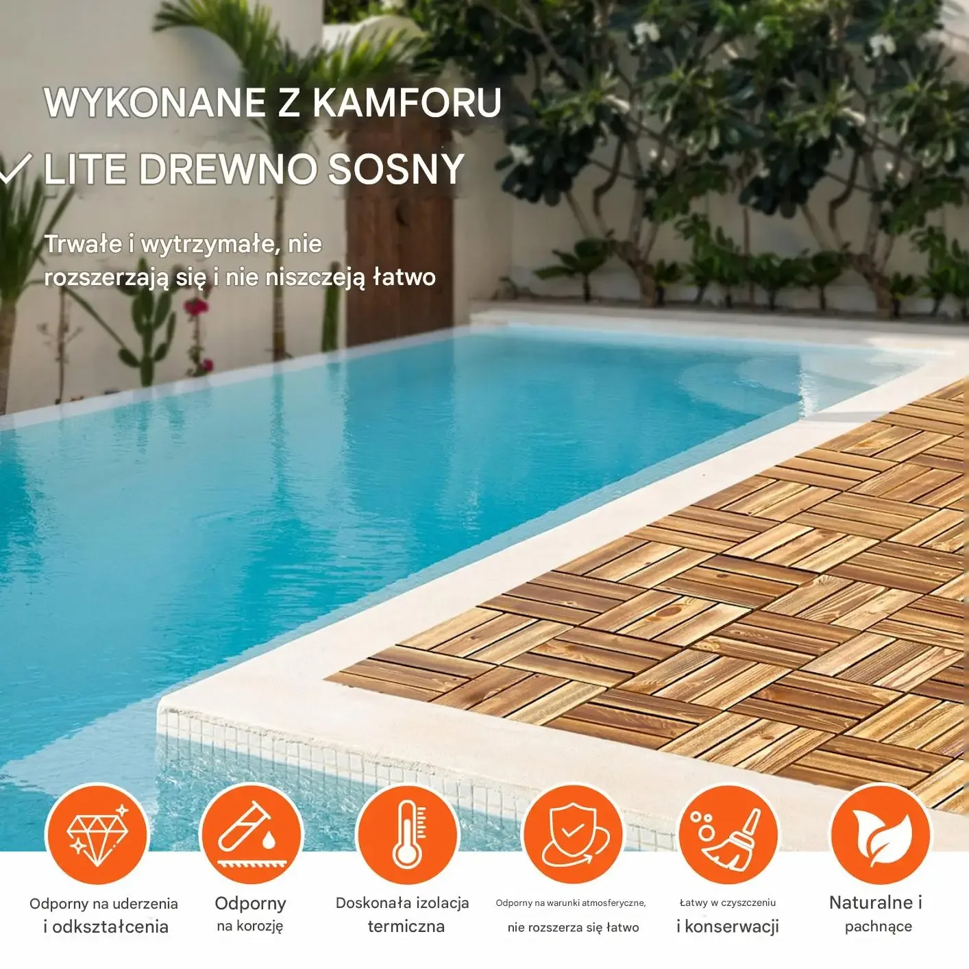 Wykonane z kamforu i lite drewno sosny, panele tarasowe z litego drewna w formie kwadratowych kafli tworzą parkingowy układ, który tworzy trwałą i estetyczną nawierzchnię tarasu oraz ogrodu. Modułowy system interlocking umożliwia łatwą i szybką instalację na zróżnicowanych powierzchniach, zapewniając stabilność i przyjemny wygląd nawet przy intensywnym użytkowaniu.