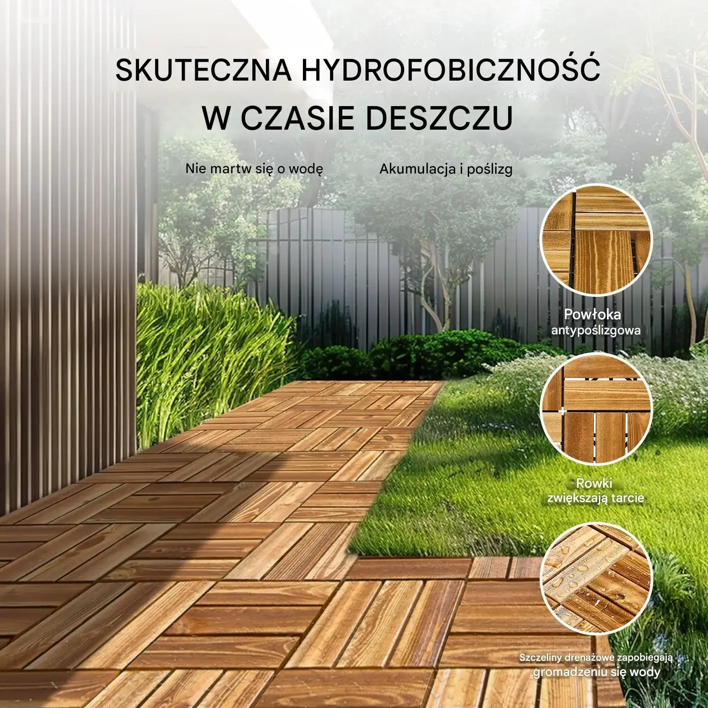 - ✔️ Wodoodporne i antypoślizgowe – Specjalna powłoka z rowkami i system drenażowy skutecznie odprowadzają wodę, zmniejszając ryzyko poślizgu.