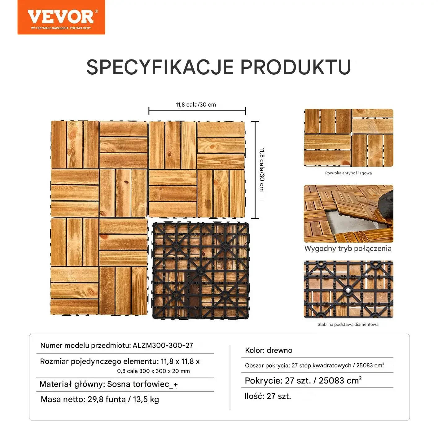 - ✔️ Powierzchnia pokrycia 0,93 m2– Zestaw zawiera 10 płytek o wymiarach 30 x 30 cm.