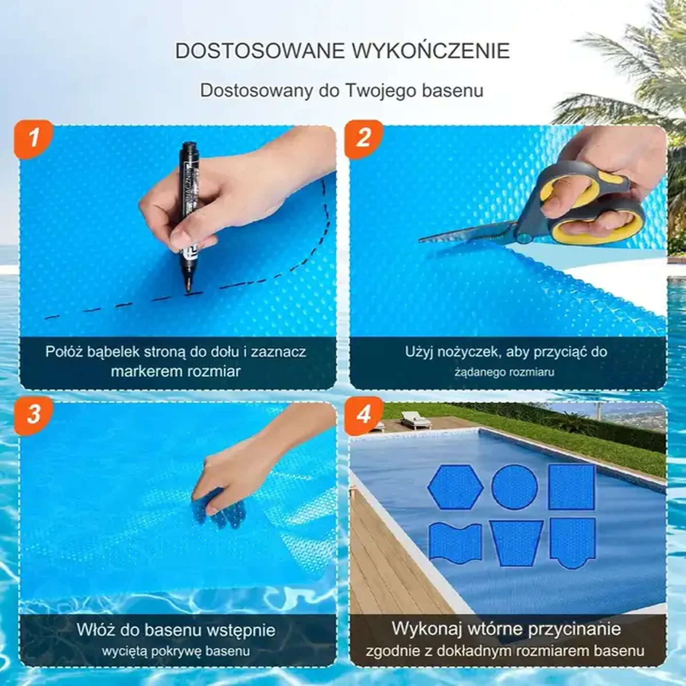 Solarna pokrywa basenowa pochłania ciepło w ciągu dnia i minimalizuje utratę ciepła w nocy, co może podnieść temperaturę wody o 8-15°C. Dzięki temu możesz cieszyć się dłuższym sezonem i niskimi kosztami ogrzewania.