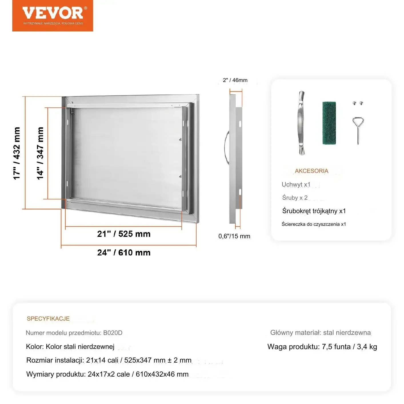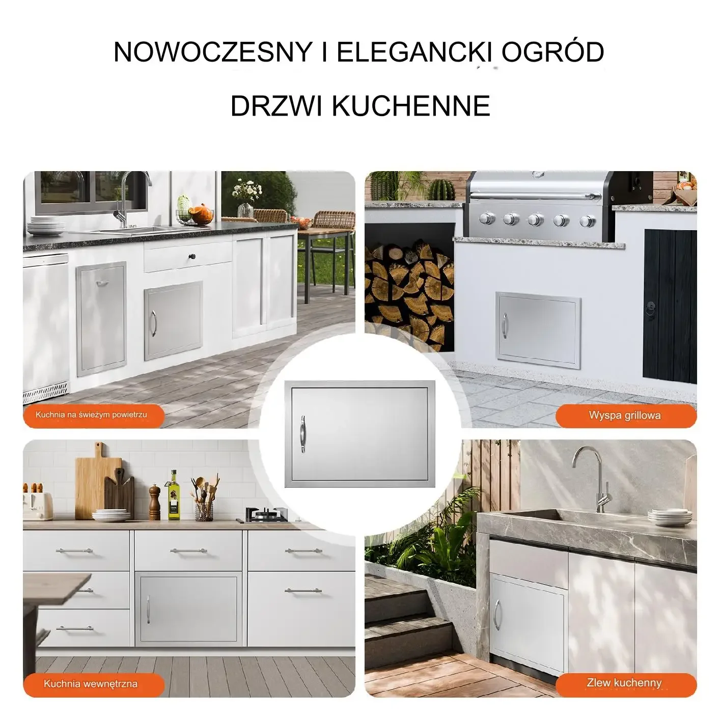 Wymiary całkowite: 610x432x46 mm, rozmiar montażowy: 347×525 mm, zaleca się zarezerwowanie na tej podstawie dodatkowych 2 mm dla lepszego działania. Drzwiczki zostały zaprojektowane specjalnie z myślą o kuchniach zewnętrznych i wyspach grillowych, dodając eleganckiego akcentu do strefy gotowania. Dzięki precyzyjnym wymiarom są łatwe w obróbce, montażu i demontażu. Dostępne w różnych rozmiarach i stylach, idealnie nadają się do kuchni wewnętrznych / zewnętrznych i wszystkich innych warunków pogodowych na zewnątrz.