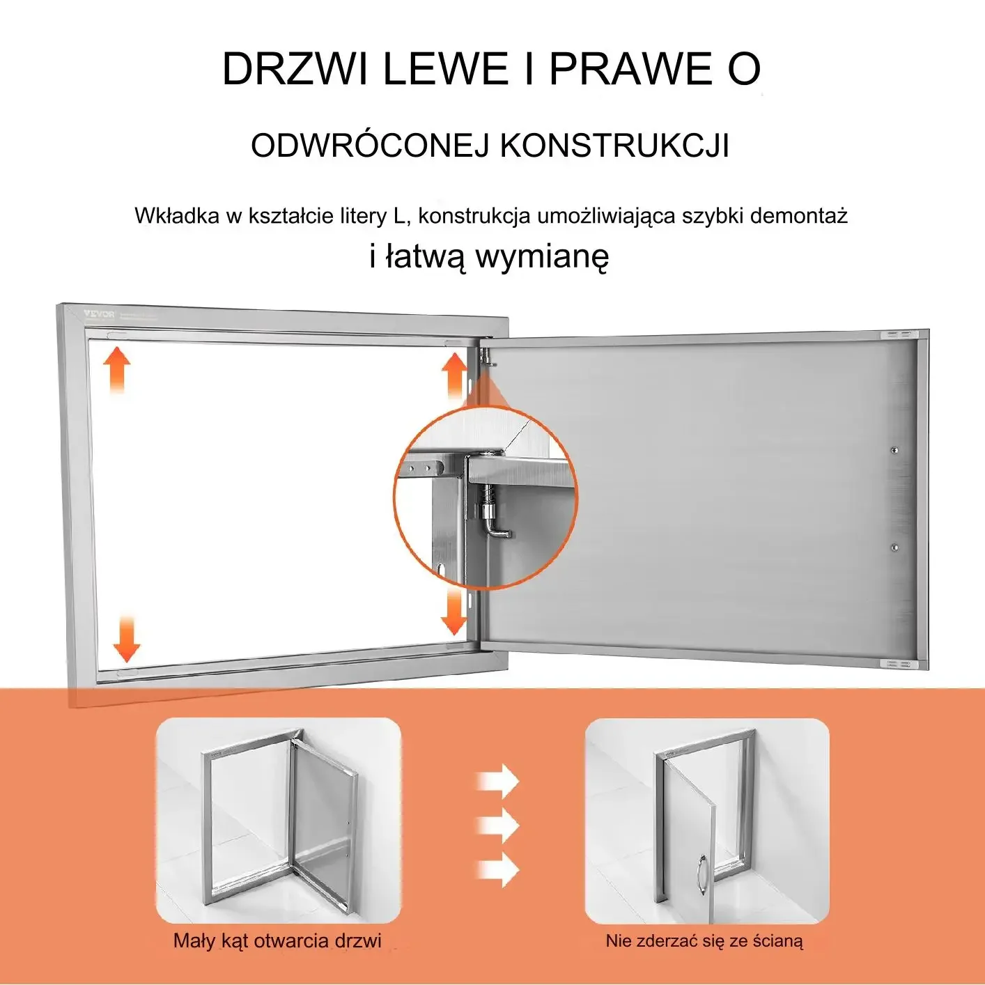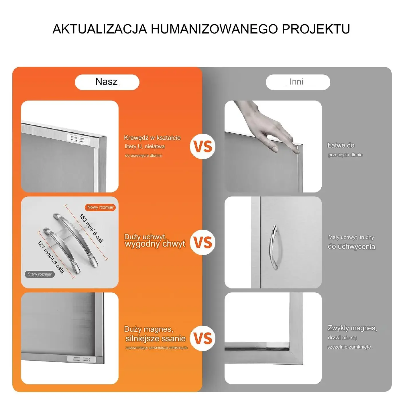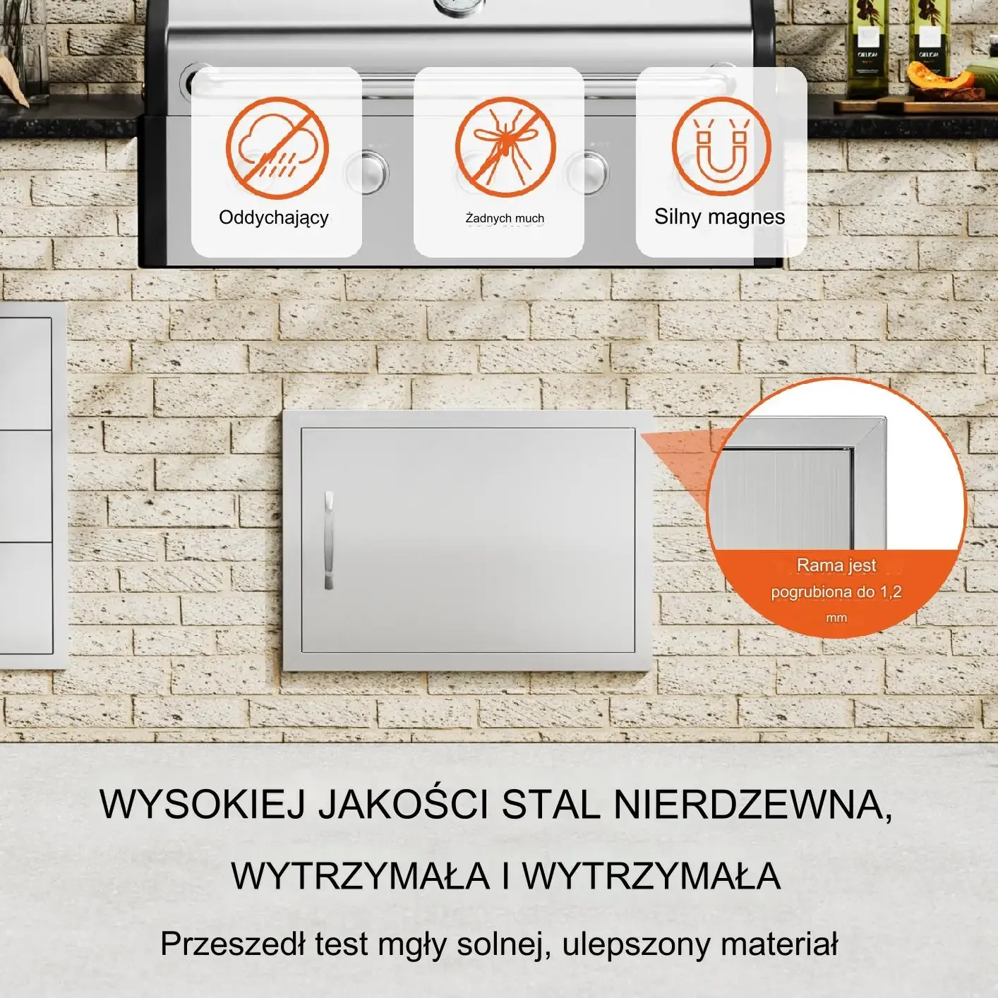 Te drzwiczki dostępu są wykonane z wytrzymałej, wysokiej jakości stali nierdzewnej, odpornej na rdzę i wodoodpornej. Można je czyścić bez pozostawiania śladów. Zintegrowana, pogrubiona konstrukcja ramy jest trwała, z całkowicie bezszwową konstrukcją, bez ostrych narożników. Unikalna konstrukcja panelu w kształcie litery U zapewnia większą wytrzymałość i trwałość. Magnesy na górze i na dole utrzymują szafkę szczelnie zamkniętą, skutecznie uniemożliwiając owadom dostęp do żywności lub czegokolwiek wewnątrz szafki.