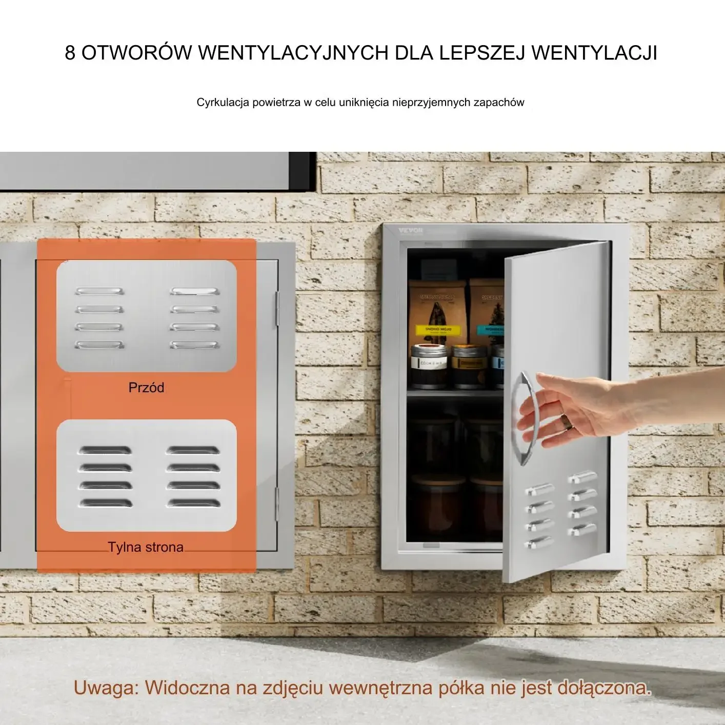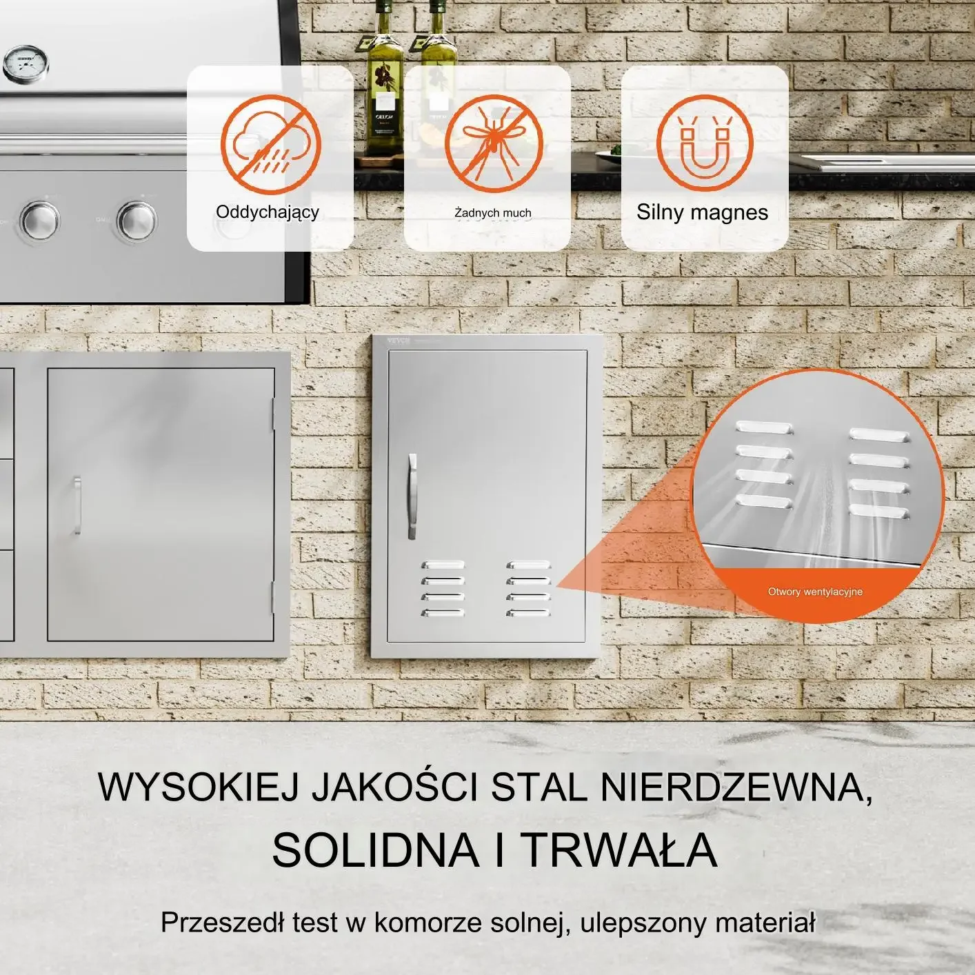 Te drzwiczki dostępu są wykonane z wytrzymałej, wysokiej jakości stali nierdzewnej, odpornej na rdzę i wodoodpornej. Można je czyścić bez pozostawiania śladów. Zintegrowana, pogrubiona konstrukcja ramy jest trwała, z całkowicie bezszwową konstrukcją, bez ostrych narożników. Unikalna konstrukcja panelu w kształcie litery U zapewnia większą wytrzymałość i trwałość. Magnesy na górze i na dole utrzymują szafkę szczelnie zamkniętą, skutecznie uniemożliwiając owadom dostęp do żywności lub czegokolwiek wewnątrz szafki.
