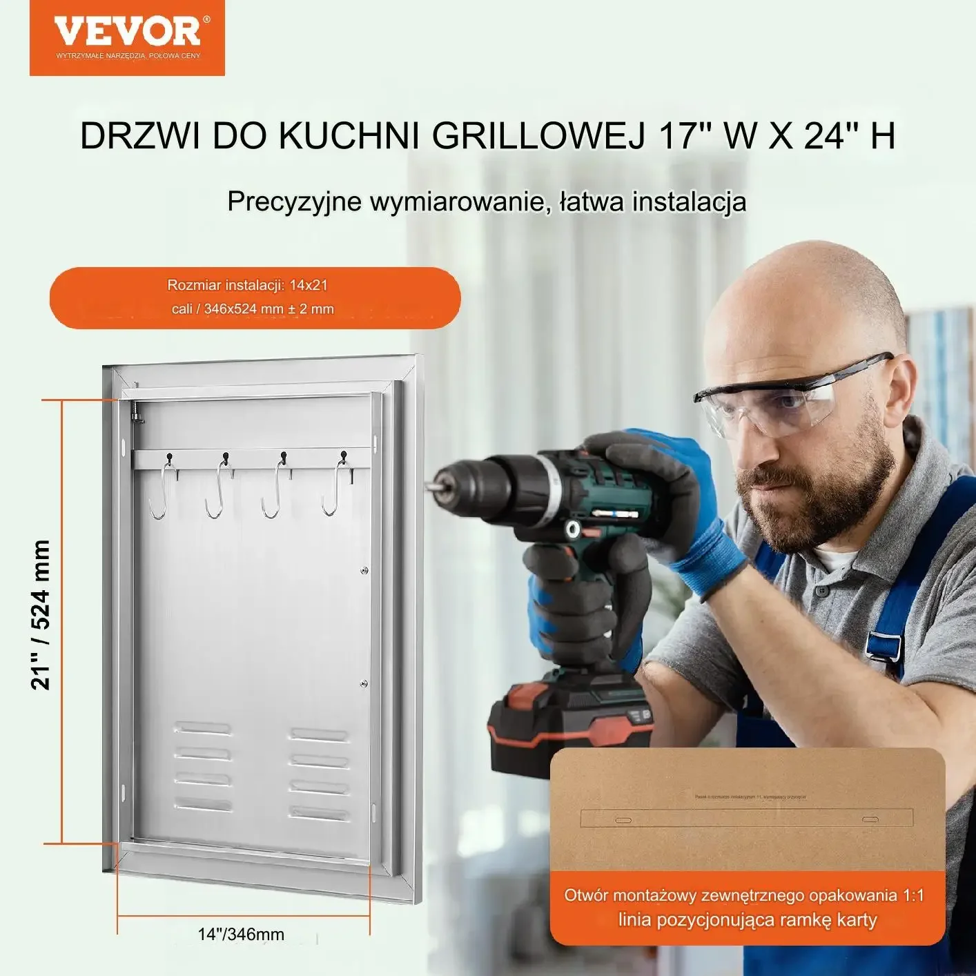 Na opakowaniu zewnętrznym wydrukowany jest perforowany rysunek CAD instalacji 1:1. Można postępować zgodnie z instrukcjami, aby umieścić szablon w miejscu, w którym należy zainstalować drzwiczki do grilla i wykonać perforację zgodnie z rysunkiem.