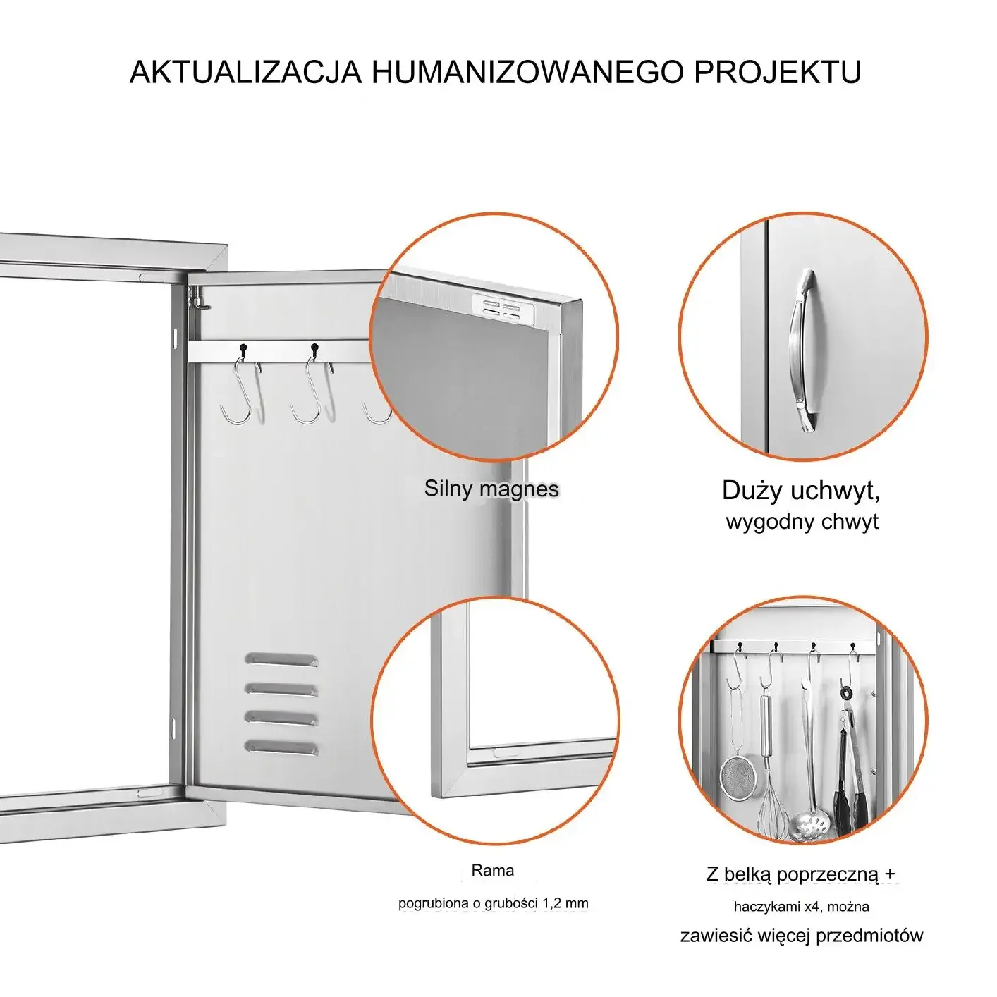 Zewnętrzne drzwiczki kuchenne wyposażone są w ergonomiczny uchwyt ułatwiający otwieranie. Krawędzie ramy drzwi są zagięte i pogrubione. Odłączana konstrukcja drzwi pozwala na usunięcie zawiasu, zmieniając kierunek otwierania drzwi. Kierunek ten można dostosować do własnych potrzeb.