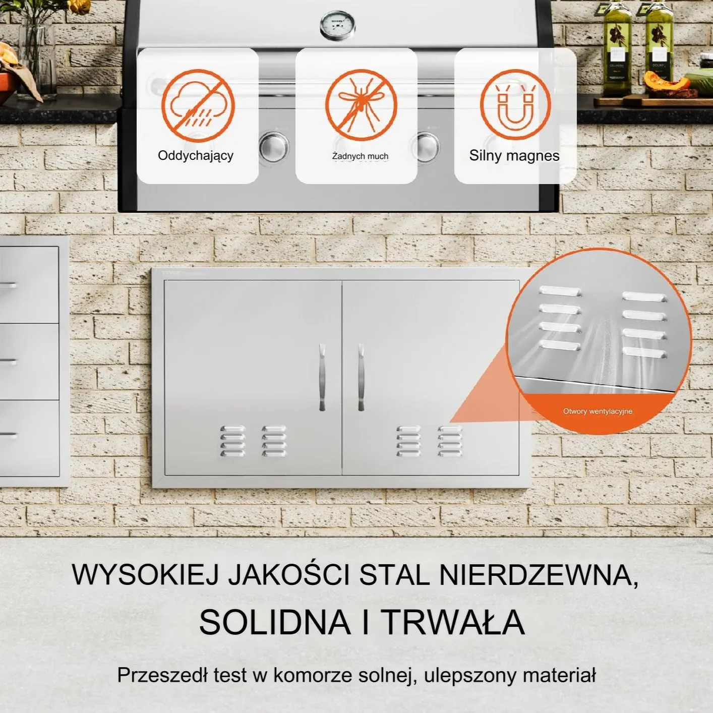 Wykorzystując nowy proces malowania proszkowego na czarny mat, odporny na rdzę i wodoodporny, łatwy do czyszczenia, wykwintny czarny kolor sprawia, że miejsce do gotowania na zewnątrz jest bardziej wyjątkowe i eleganckie. Zintegrowana zagęszczona konstrukcja ramy jest trwała, z całkowicie bezszwową konstrukcją, bez ostrych narożników. Unikalny panel w kształcie litery U zapewnia lepszą wytrzymałość i trwałość. Magnesy na górze i na dole utrzymują szafkę szczelnie zamkniętą, skutecznie uniemożliwiając owadom dostęp do żywności lub czegokolwiek wewnątrz szafki.