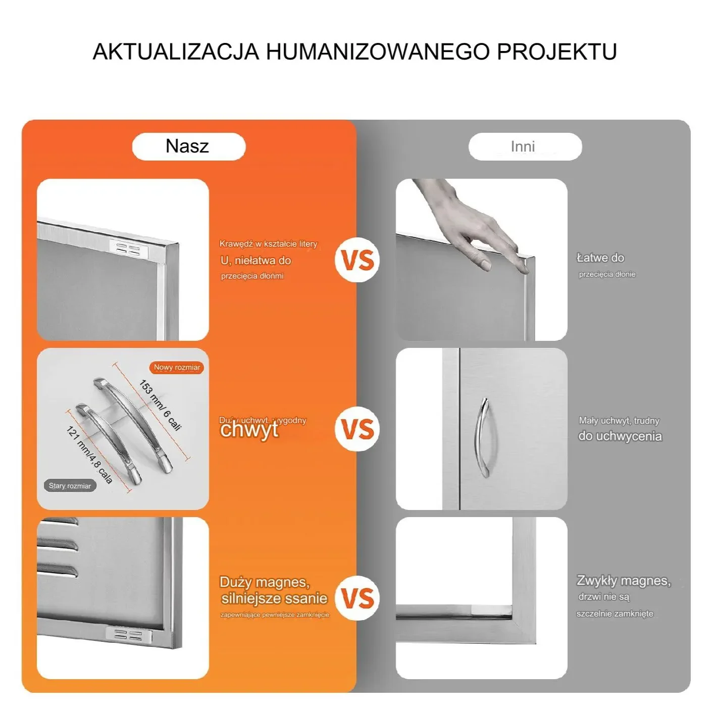 Ukryty uchwyt sprawia, że drzwi wyglądają lepiej i zmniejsza ryzyko przypadkowego stłuczenia. Krawędzie ramy drzwi są wygięte i pogrubione dla bezpieczniejszego użytkowania. Wyposażony w żaluzjowe otwory wentylacyjne, umożliwiające lepszą cyrkulację powietrza w schowku. Zapewnia bardziej przyjazne dla użytkownika doświadczenie, pozwalając cieszyć się gotowaniem w kuchni na świeżym powietrzu bez obaw.