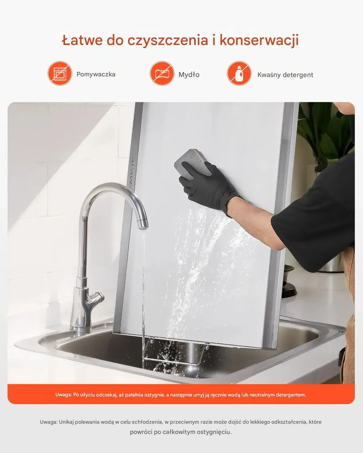 - ➡️ Bezproblemowe czyszczenie: Nieprzywierająca powłoka i gładka powierzchnia wymagają tylko przetarcia miękką gąbką z ciepłą wodą i mydłem