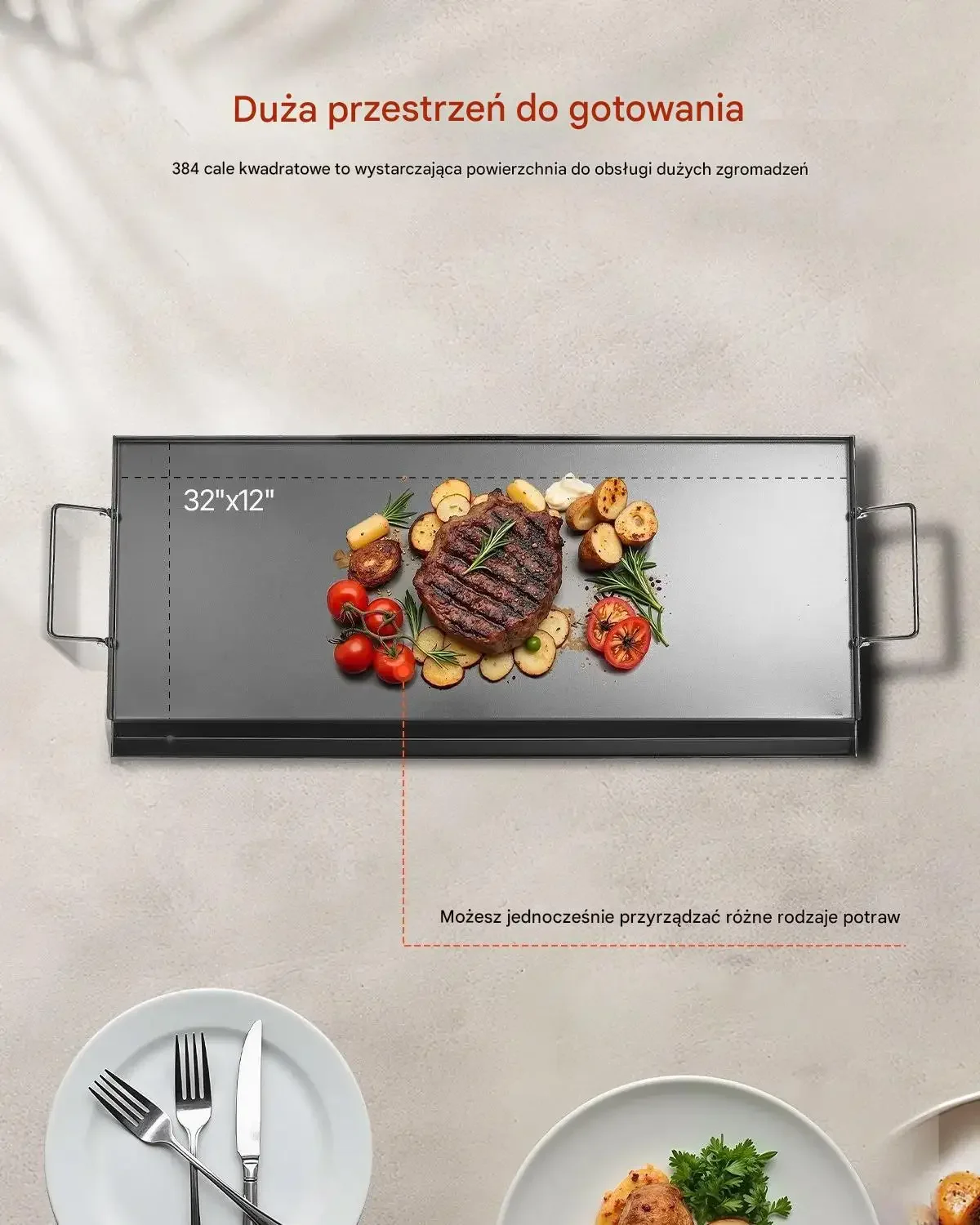 Powierzchnia robocza wynosząca około 2477 centymetrów kwadratowych (odpowiednik 384 cali kwadratowych) jest wystarczająca do obsługi dużych zgromadzeń. Przestronna płyta o wymiarach strefy roboczej około 81 cm na 30 cm pozwala na swobodne i jednoczesne przyrządzanie wielu różnych rodzajów potraw.