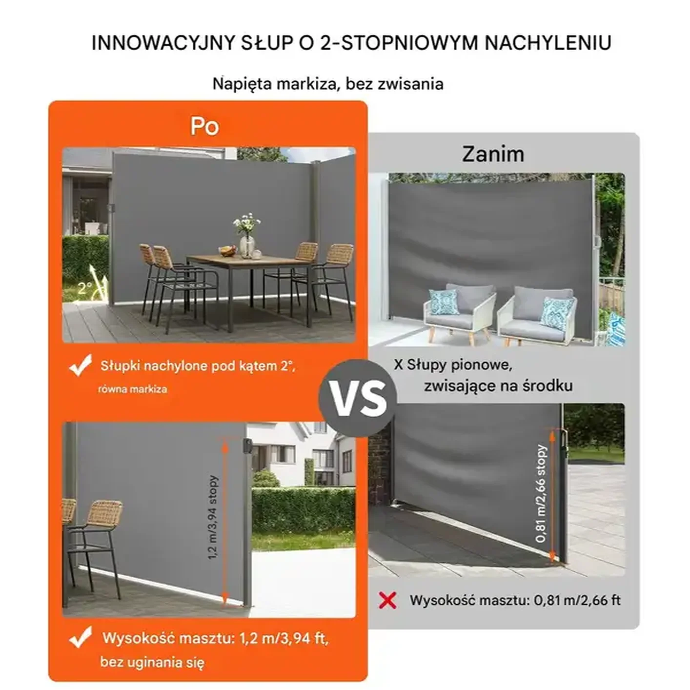 - ✅ Ochrony przed słońcem i wiatrem na balkonach, tarasach i w ogrodach.