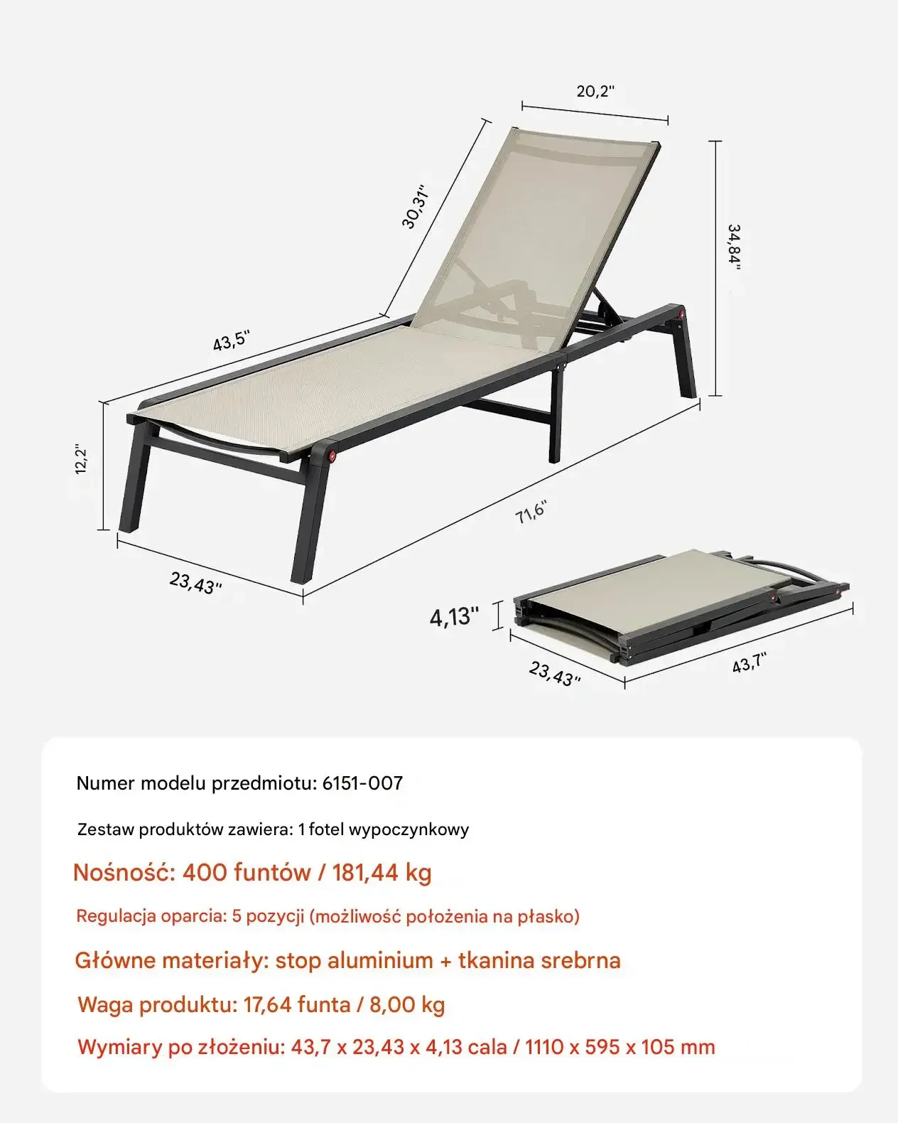 Wyposażony w solidną trójkątną ramę, wzmocnione kwadratowe stalowe rury, aluminiowe zamki 8 mm i dwuwarstwowe elastyczne linki, ten 26-calowy fotel o zerowej grawitacji zapewnia wyjątkową stabilność i obsługuje do 500 funtów. Idealny dla użytkowników o różnym wzroście.