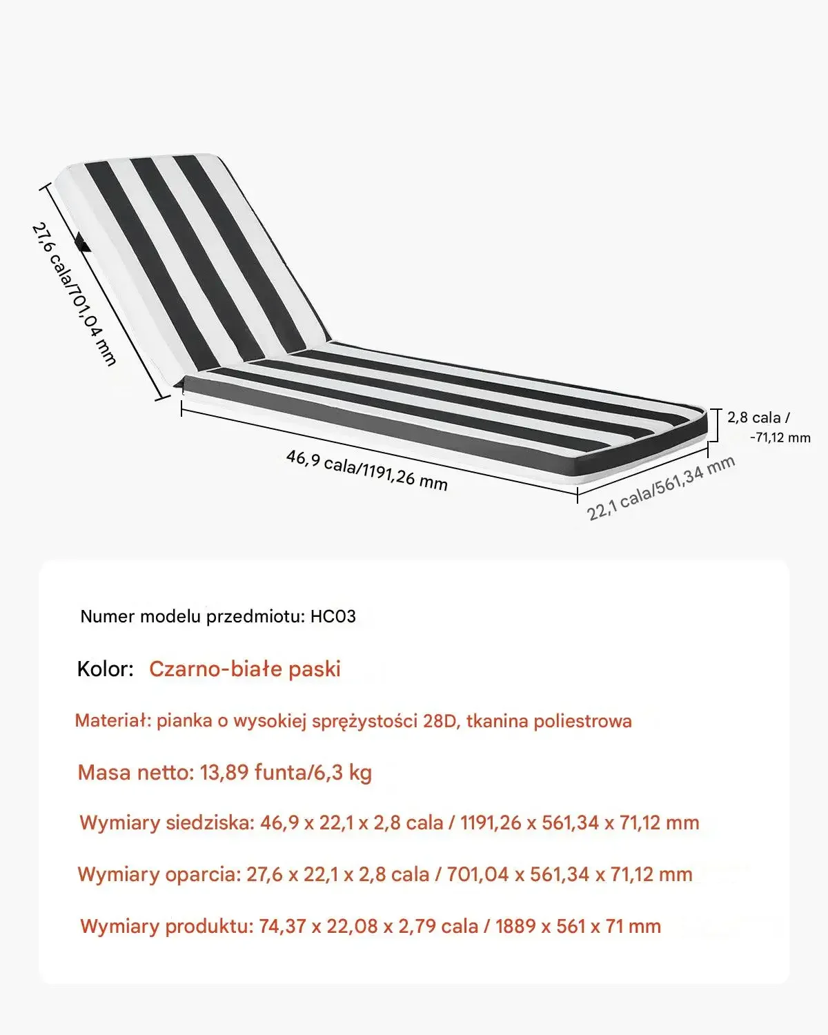 - ✅ Uniwersalny rozmiar: Poduszki pasują do większości standardowych leżaków, wymiary siedziska: 122 x 66 x 10 cm, wymiary oparcia: 81 x 66 x 10 cm