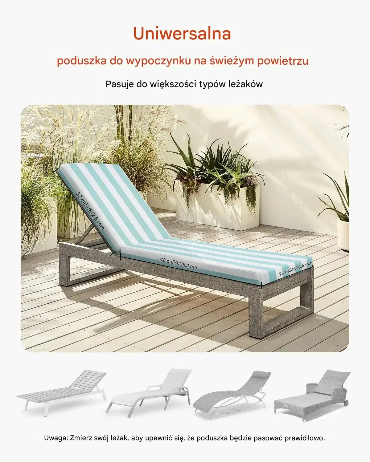 - ✅ Uniwersalny rozmiar: Poduszki pasują do większości standardowych leżaków, wymiary siedziska: 122 x 66 x 10 cm, wymiary oparcia: 81 x 66 x 10 cm