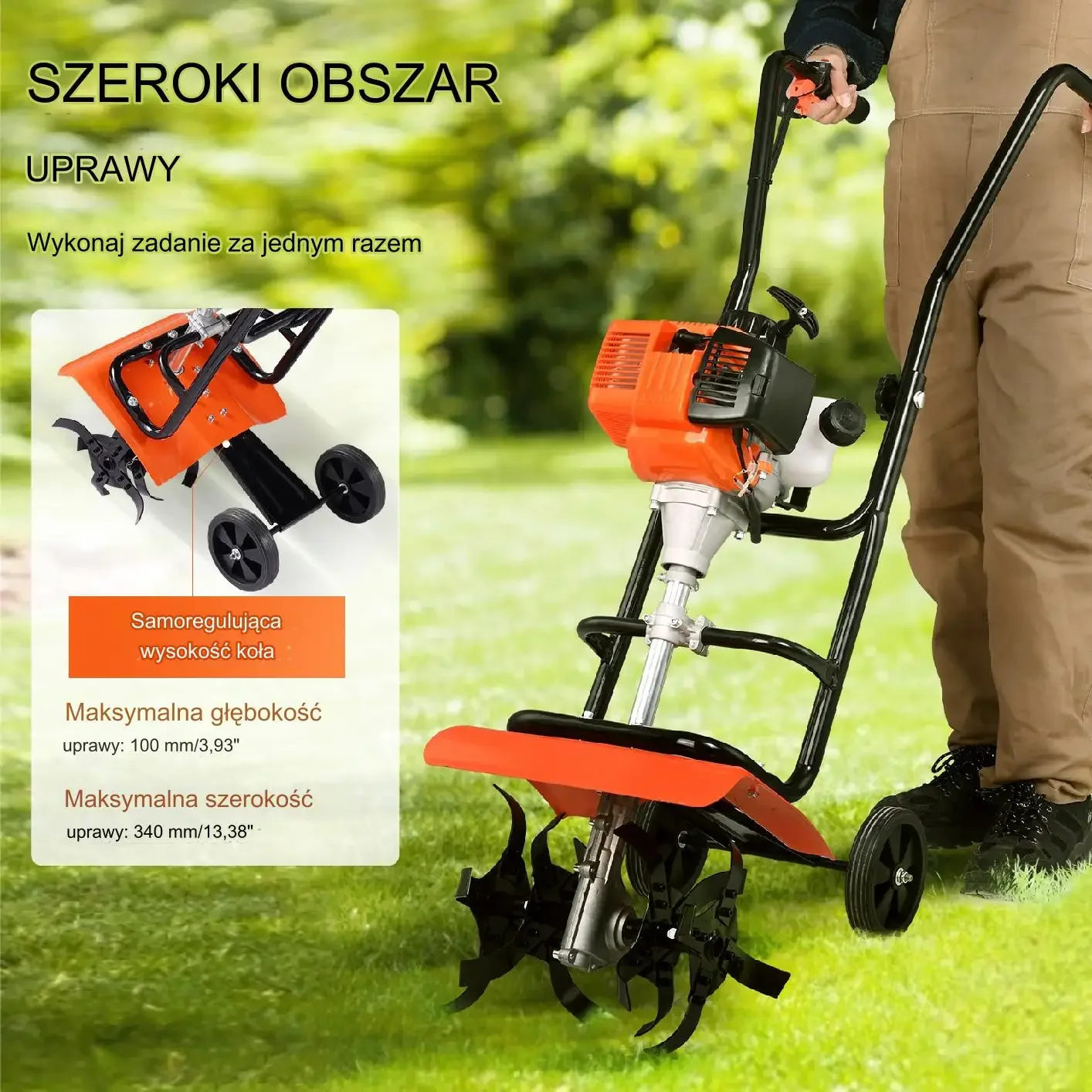Wyposażony w cztery zęby do efektywnej orki glebogryzarka ma szerokość roboczą 340 mm i głębokość 100 mm. Glebogryzarka skutecznie radzi sobie zarówno z siewem, jak i orką. Regulowany zespół płozy umożliwia ustawienie wysokości lub głębokości, a duże koła napędowe 14,7 cm ułatwiają poruszanie się po ziemi z mniejszym oporem.