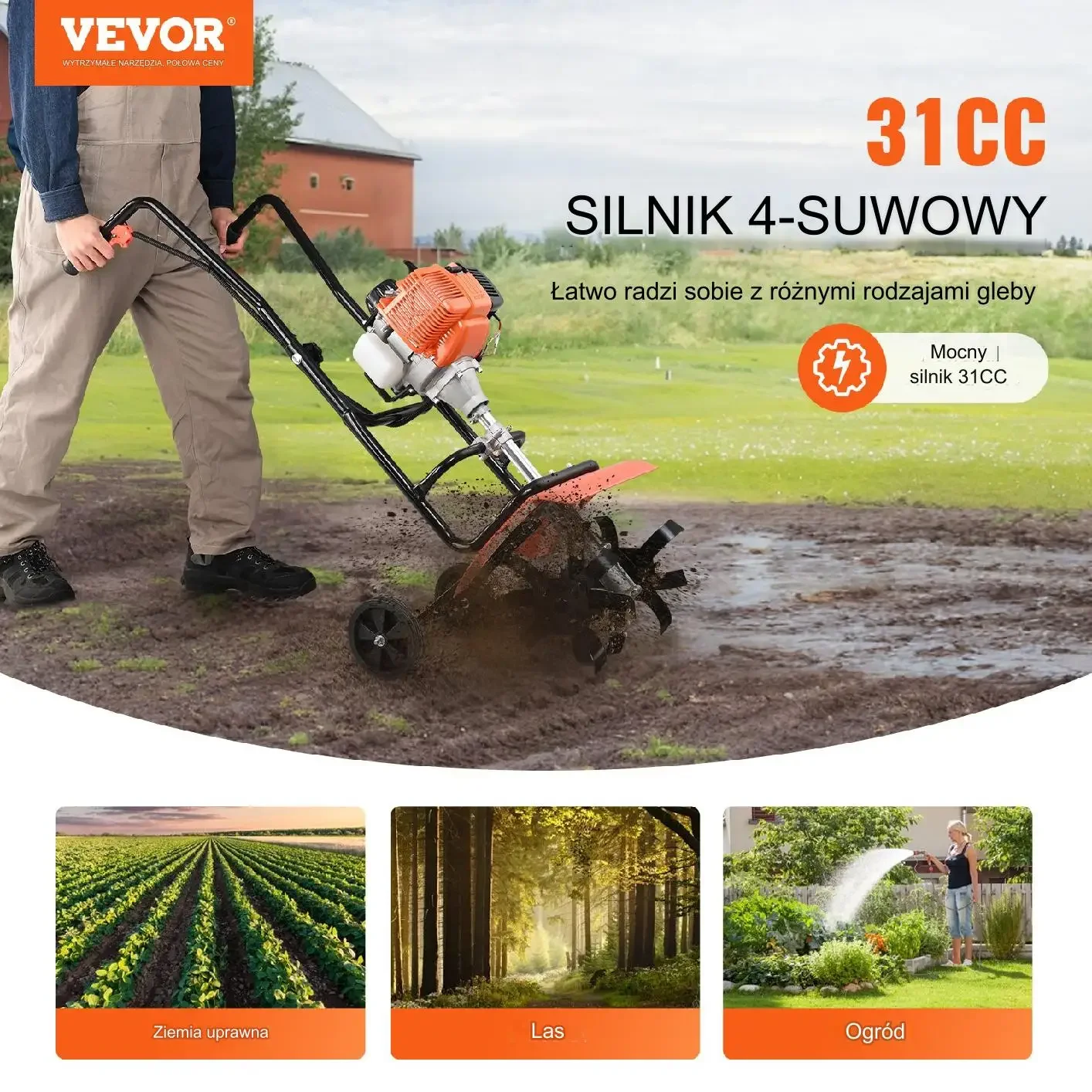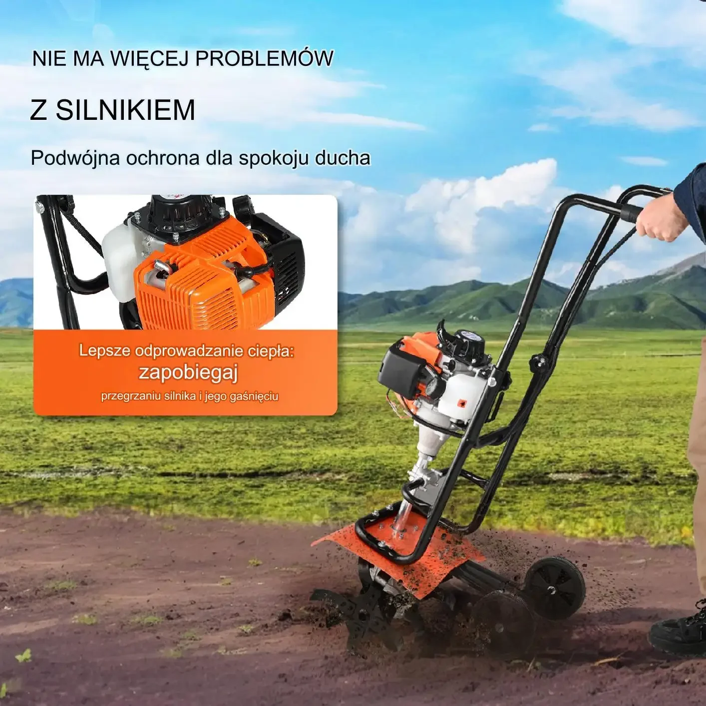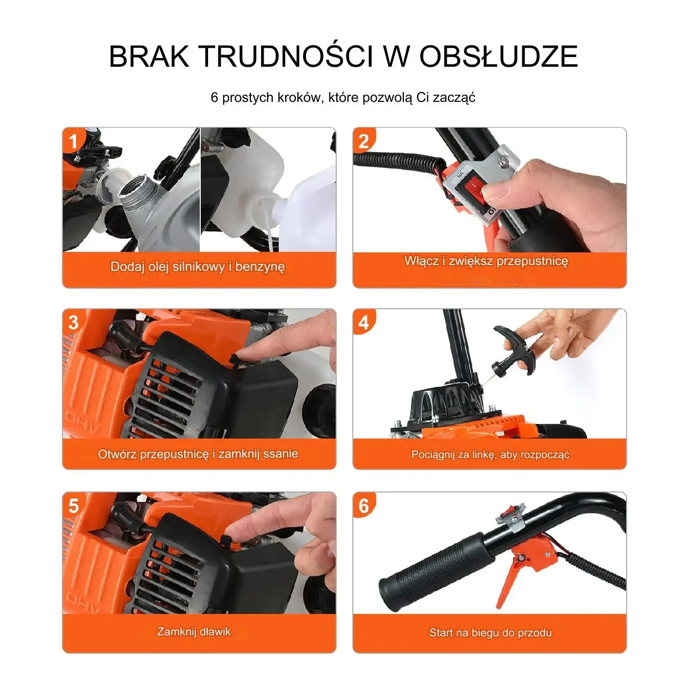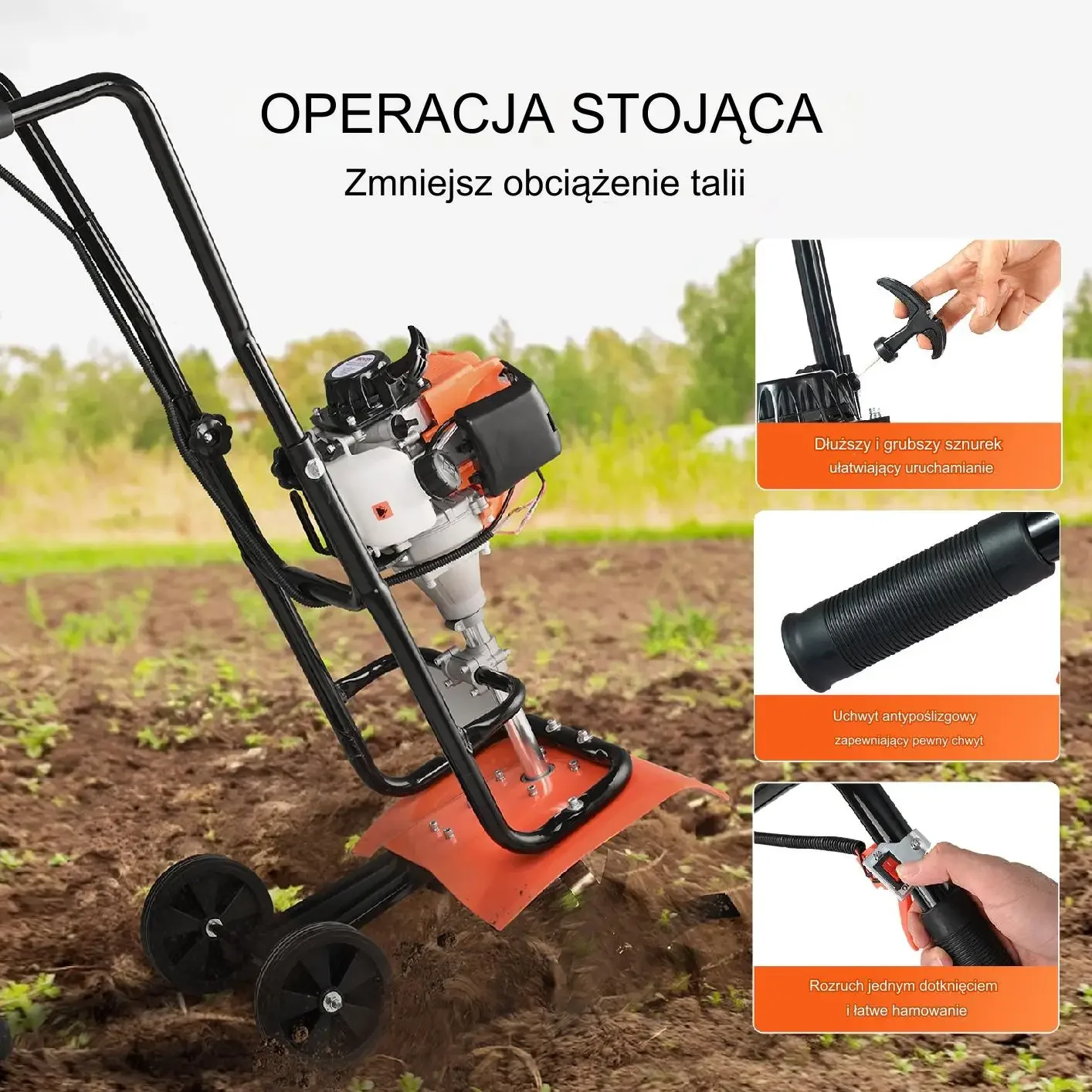 Praca w pozycji stojącej sprawia, że orka jest łatwa i ergonomiczna. Pogrubiona i długa linka zapewnia niezawodny rozruch, a zamontowane na uchwycie przełączniki i hamulce zapewniają lepszą kontrolę. Osłona ochronna nad zębami zapobiega rozpryskiwaniu się gleby, kamieni lub gruzu i powodowaniu obrażeń.