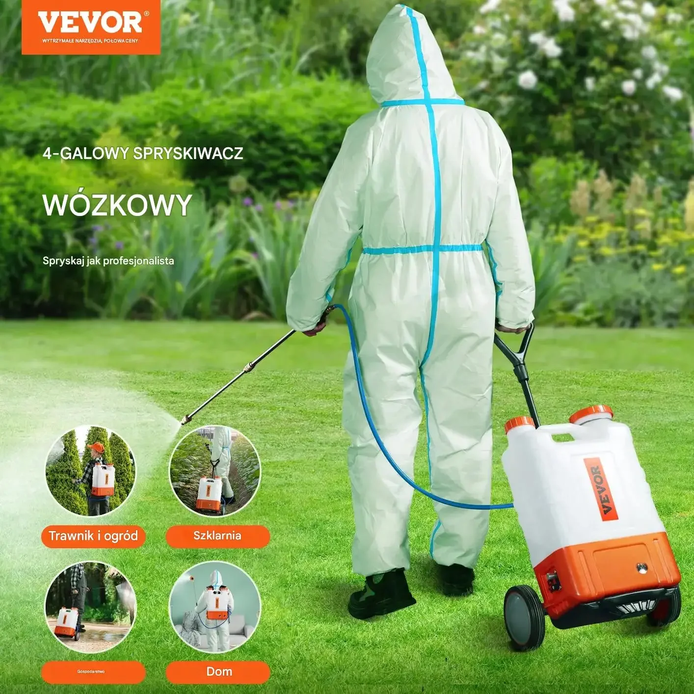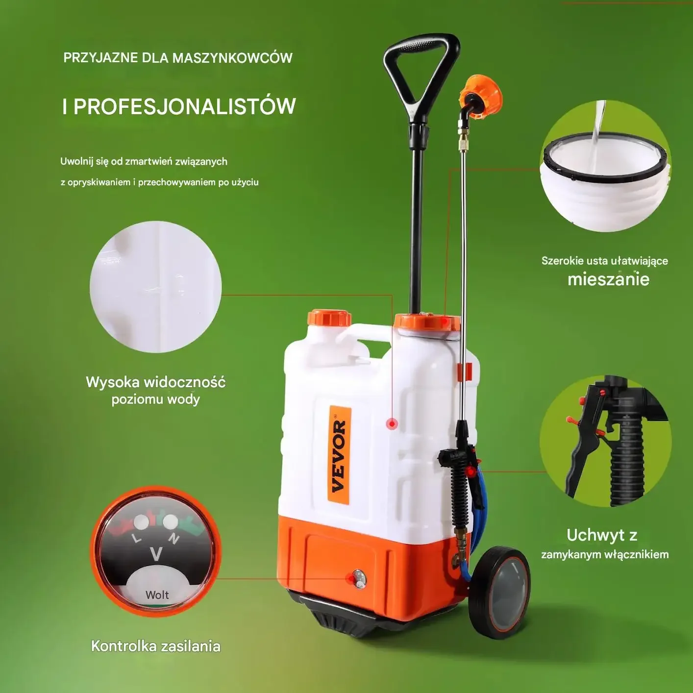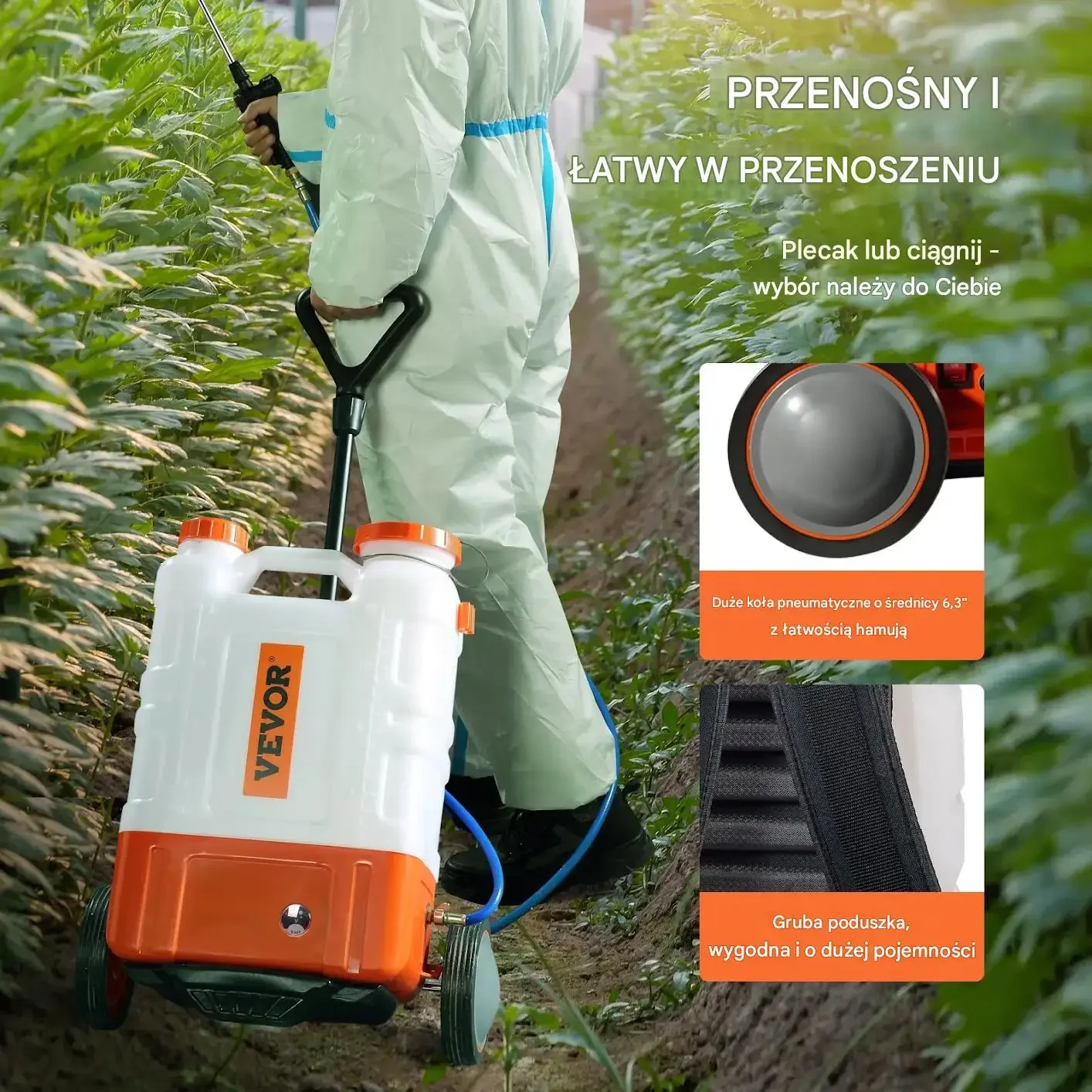 Model ten oferuje możliwość korzystania jako plecak lub spryskiwacz na kółkach, co ułatwia transport. Duże koła o średnicy 16 cm zapewniają stabilność i swobodne poruszanie się po różnorodnym terenie.