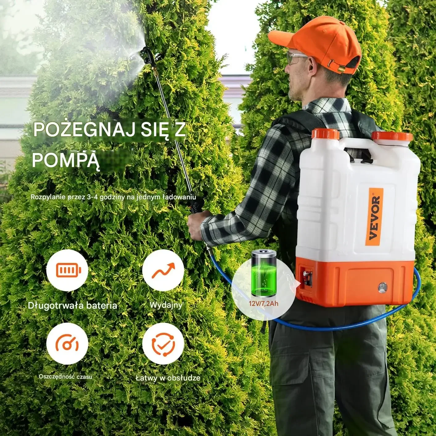 - ✅ Wydajna bateria 12 V / 7,2 Ah: Umożliwia ciągłe opryskiwanie przez 3–4 godziny na jednym ładowaniu.