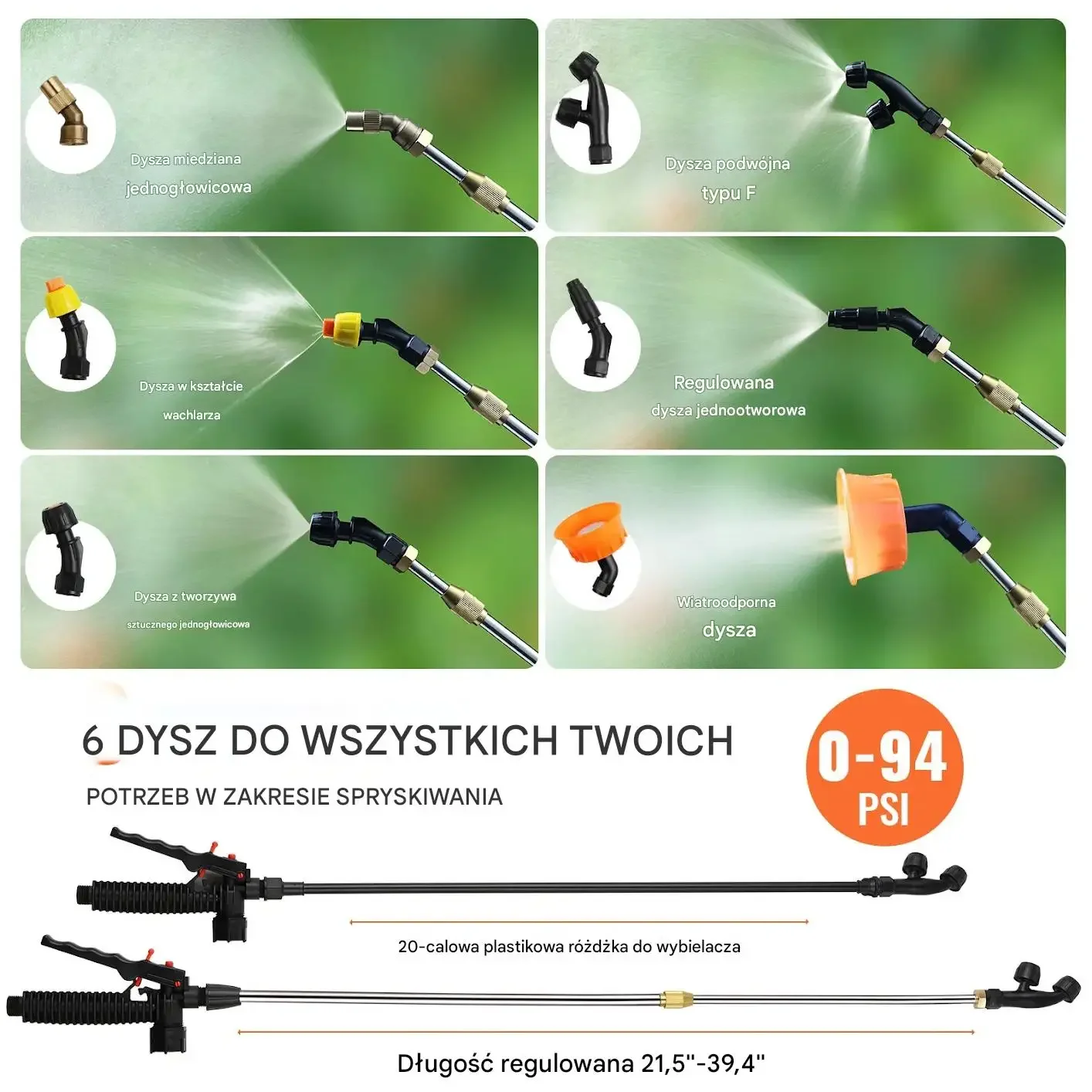 - ✅ Regulowane dysze: 6 dysz oraz 2 lancy pozwalają dostosować rodzaj oprysku do różnych zadań.