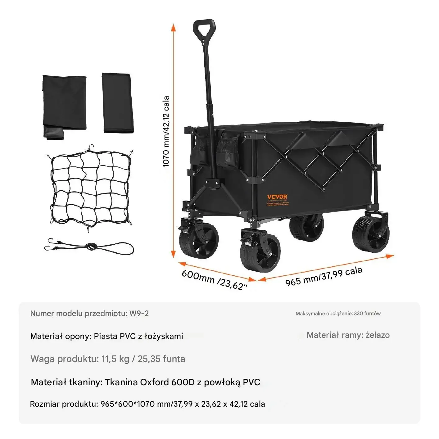 Wytrzymała i przenośna składana taczka z solidną ramą z żelaza pokrytego powłoką proszkową, odporna na korozję i trwała. Wytrzymuje obciążenie do 136 kg, idealna do wypraw na świeżym powietrzu, rodzinnych pikników i codziennego użytku jako niezawodny pomocnik transportowy.