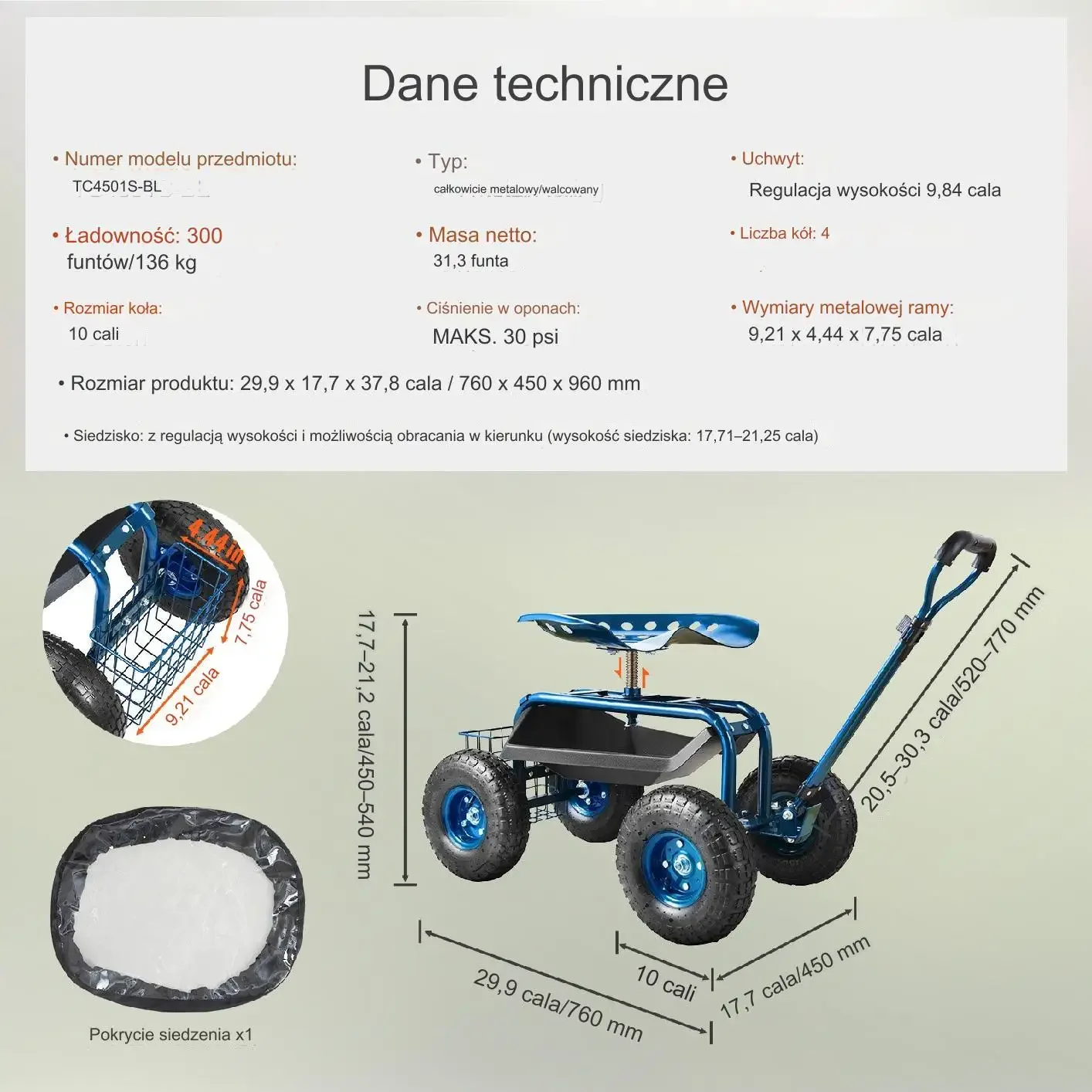 - ✅ Koła PVC o średnicy 13 cm z łożyskami obracającymi się o 360° dla łatwego manewrowania na różnych nawierzchniach