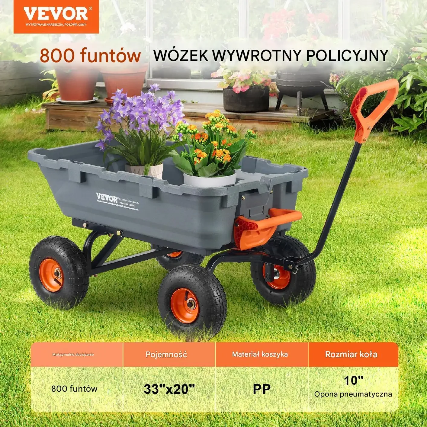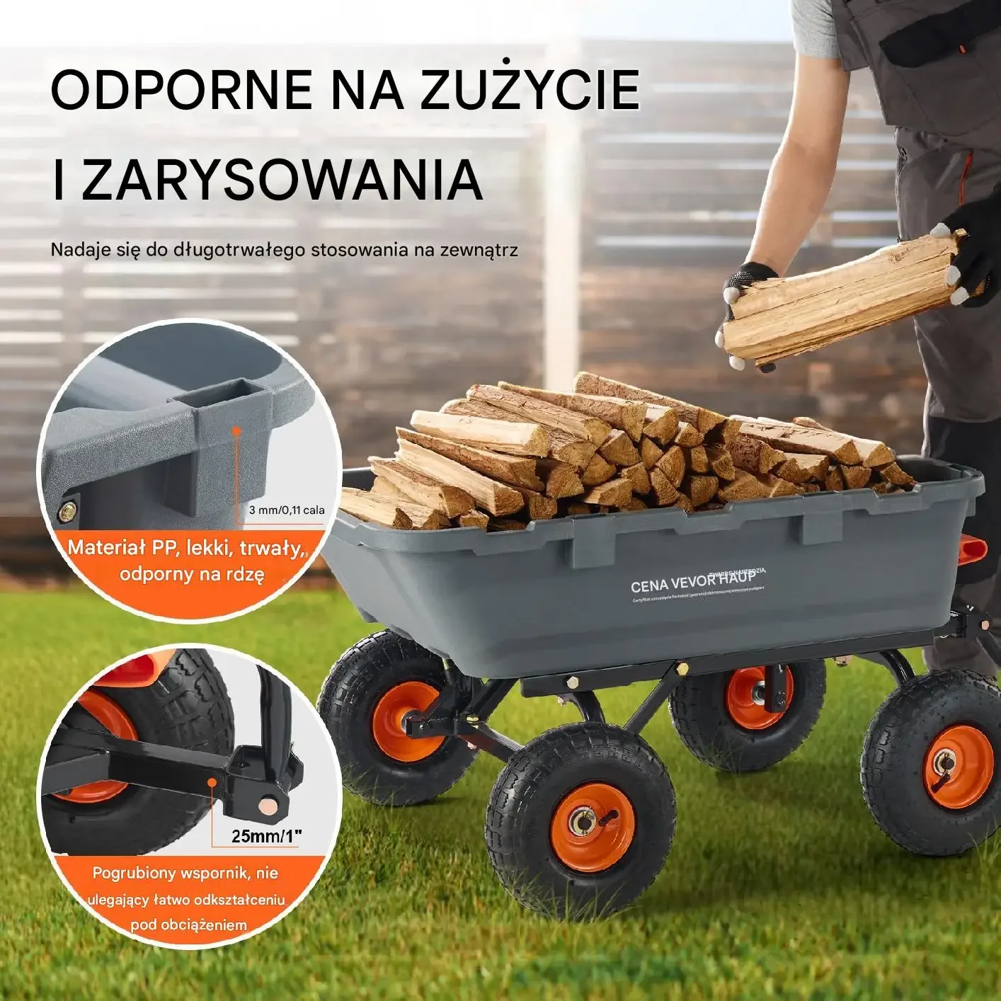 Wytrzymały wózek samowyładowczy o wysokiej nośności 363 kg i dużej pojemności umożliwia bezproblemowy transport ciężkich ładunków. Solidna metalowa rama z powłoką ochronną oraz mocne gumowe koła o średnicy 25,5 cm gwarantują trwałość i wygodę nawet na nierównym terenie.