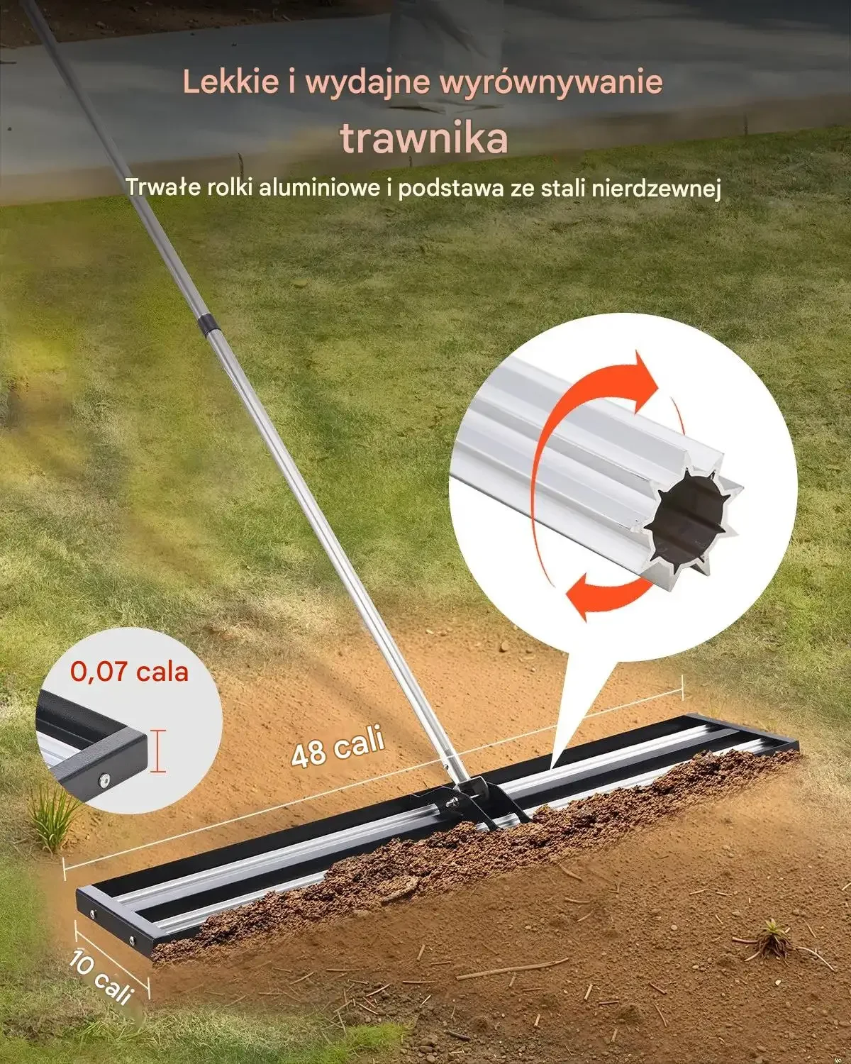 Lekkie i wydajne wyrównywanie trawnika. Trwałe rolki aluminiowe i podstawa ze stali nierdzewnej. Grubość głowicy: 0,2 cm. Długość głowicy: 121,9 cm. Szerokość głowicy: 25,4 cm.