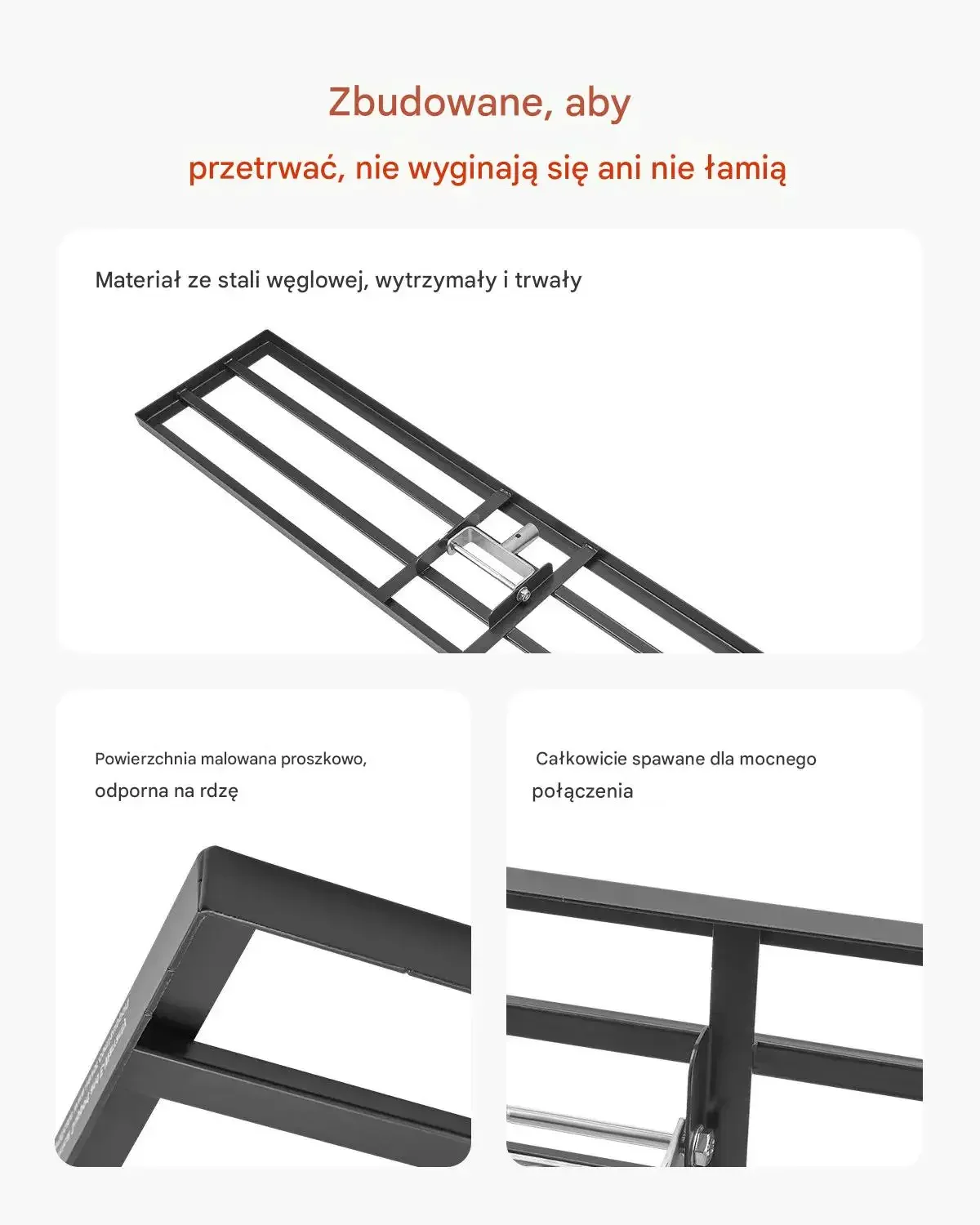 Zbudowane, aby przetrwać — nie wyginają się ani nie łamią. Materiał ze stali węglowej, wytrzymały i trwały. Powierzchnia malowana proszkowo, odporna na rdzę. Całkowicie spawane dla mocnego połączenia.