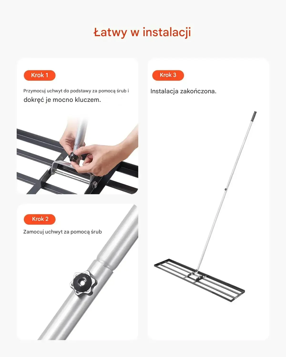 Łatwy w instalacji. Krok 1: Przymocuj uchwyt do podstawy za pomocą śrub i dokręć je mocno kluczem. Krok 2: Zamocuj uchwyt za pomocą śrub. Krok 3: Instalacja zakończona.