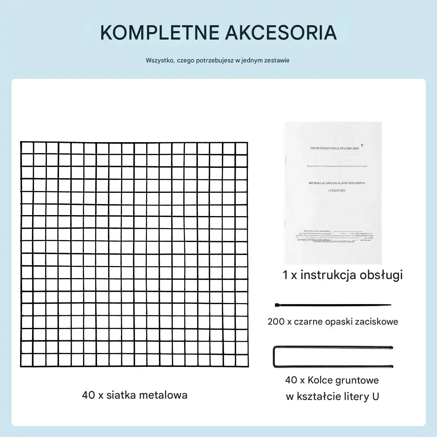 Nasze klatki dla roślin zewnętrznych zawierają 40 sztuk metalowej siatki, 200 czarnych opasek zaciskowych, 40 kolców w kształcie litery U i 1 instrukcję obsługi. Każdy element jest precyzyjnie kuty w celu zapewnienia długotrwałego użytkowania.